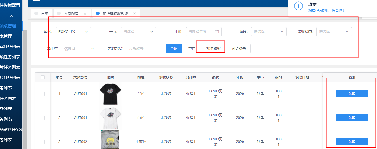 线下拿到拍照样,线上进入拍照样领取管理,选择品牌、季节、年份、波段、领取状态(未领取)、大货款号进行查询,点击领取,自动生成领取日期、领取件数、延期天数、领取人,点击编辑可修改领取件数和备注,如领取错误,可取消领取,则领取日期、领取件数、延期天数、领取人均返回领取前状态。