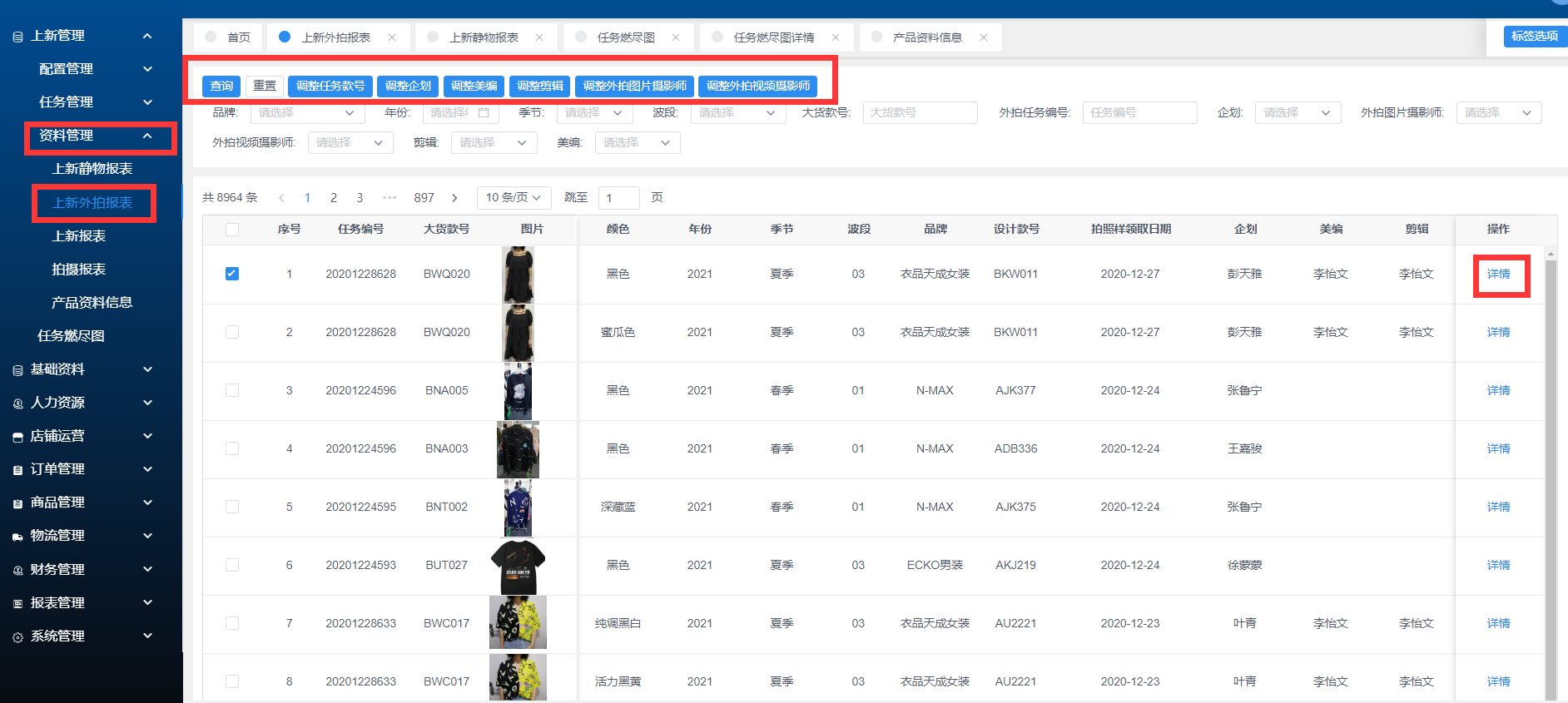 上新外拍报表,主要用来对流程中错误选择的款号,美编,外拍视频摄影师和外拍图片摄影师等进行调整