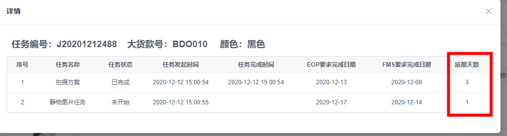 详情的延期天数:fms的要求完成时间和实际完成时间的差值