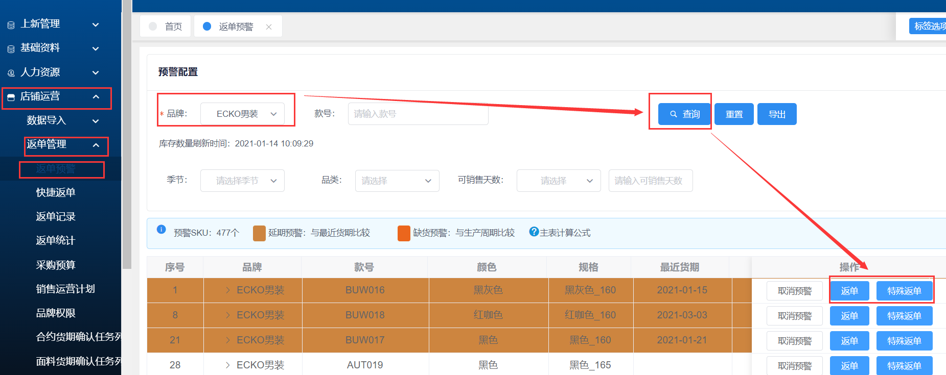 根据计算公式,计算出需要返单的款,可以取消预警、返单、特殊返单。