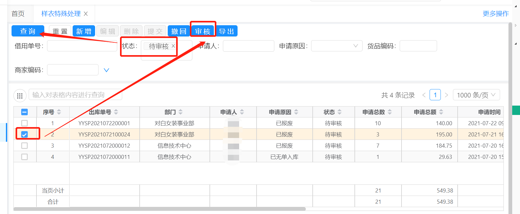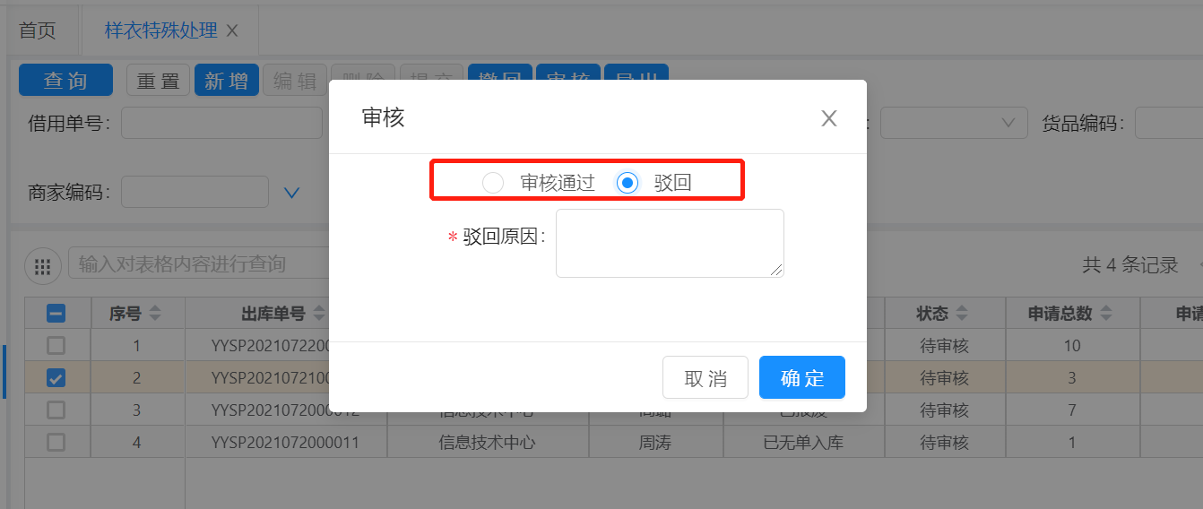 2.1、筛选状态=待审核的申请单,查看申请原因后,勾选,点击【审核】按钮