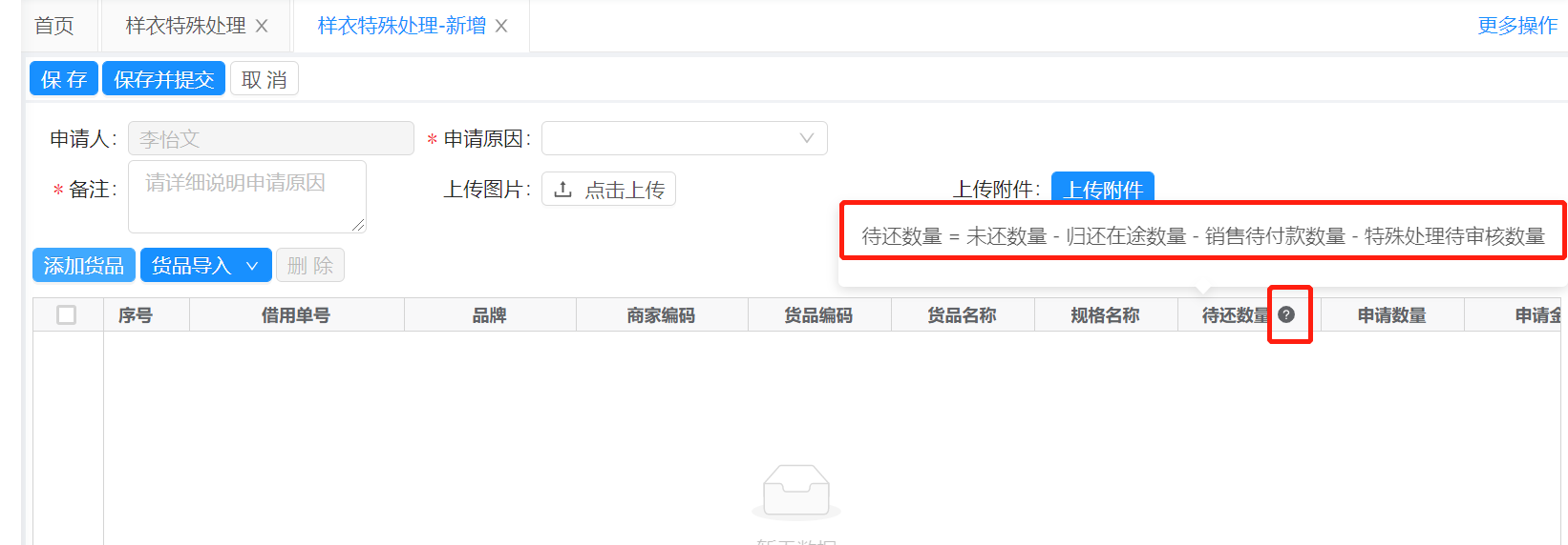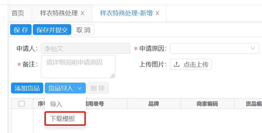 1.2、在“样衣特殊处理-新增”页面,填写必须的信息