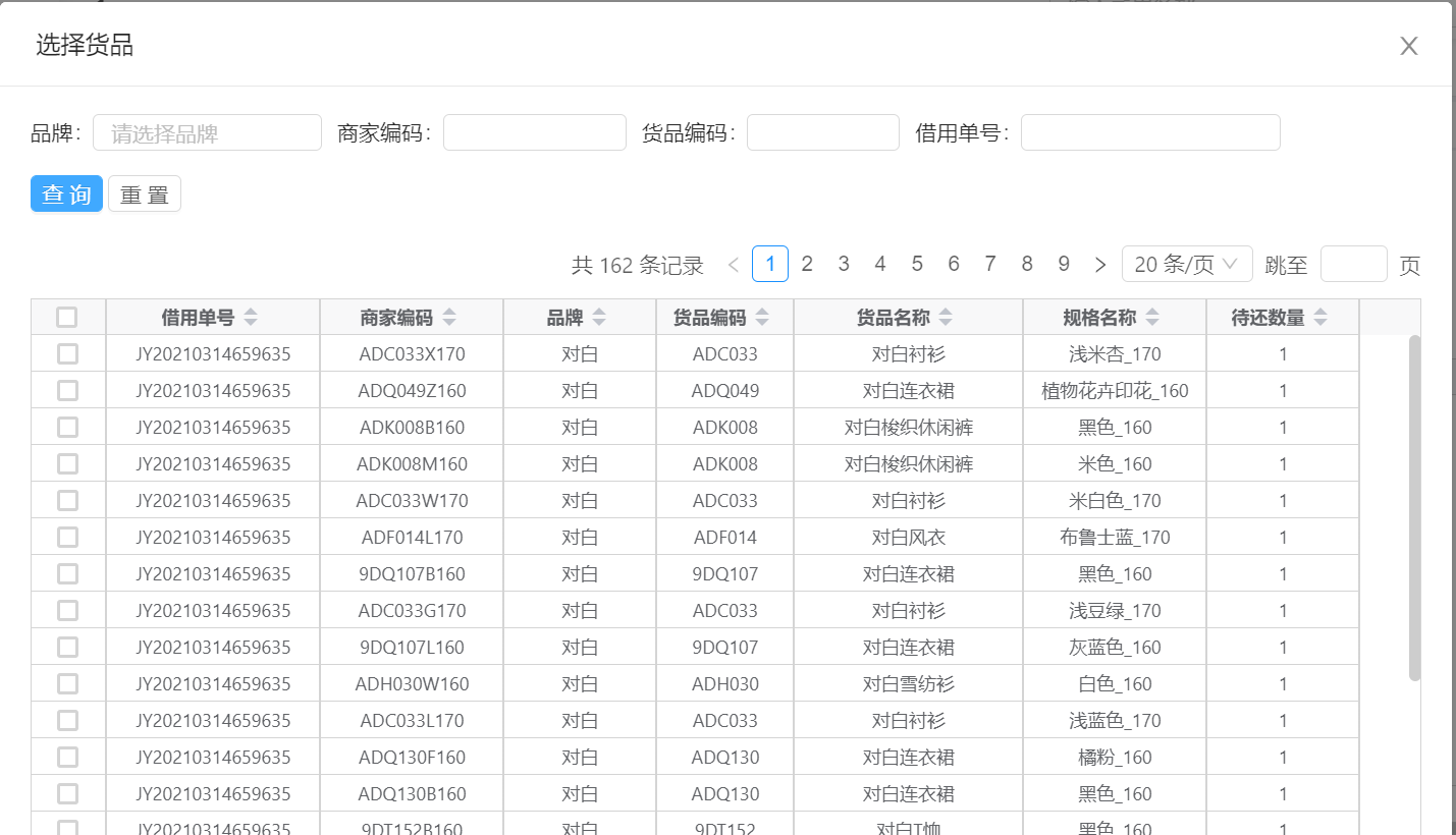 弹窗查询出的货品,为该借用人(交接人)所有未还的货品,如待还数量为0,则根据待还数量算法去释放占用数量。