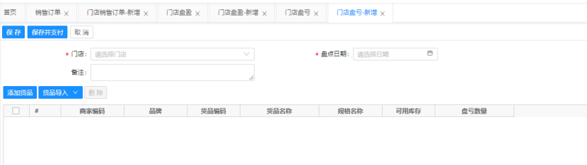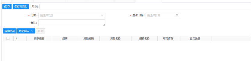 必选选择“门店”、“盘点日期”,进行货品添加。数量<门店可用库存。