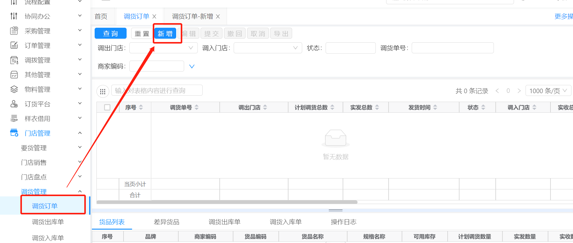 在“调货管理-调货订单”页,点击【新增】按钮。