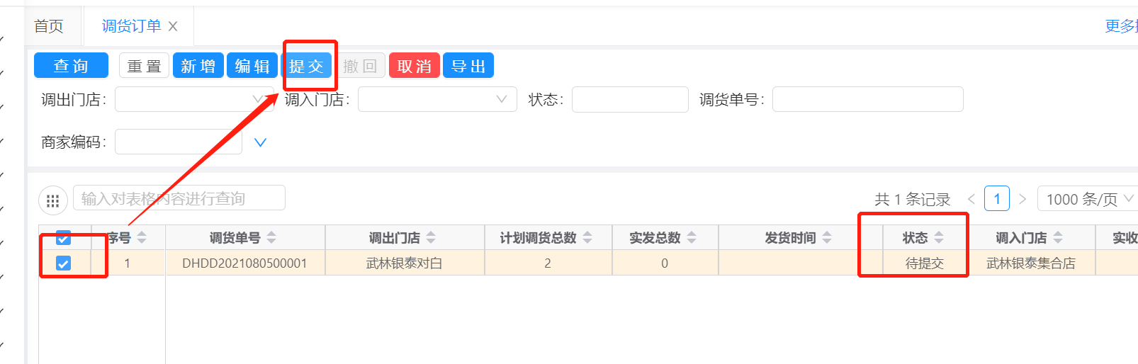勾选提交调货单,提交后,需要在“调货管理-调货出库单”页,进行审核。