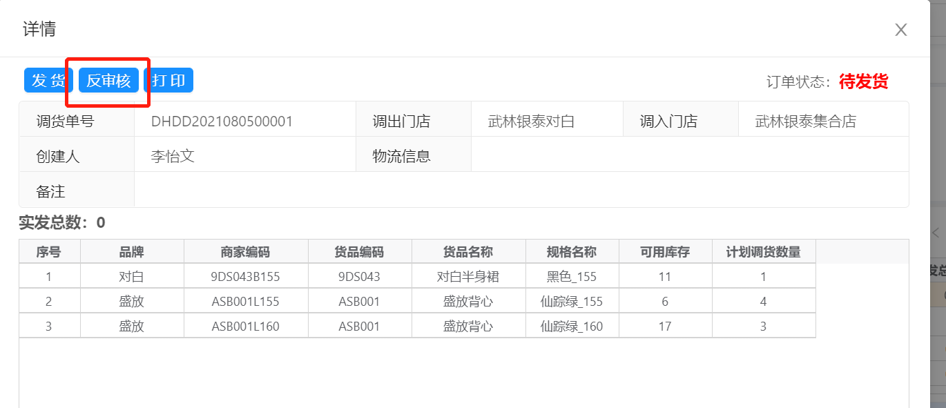 在弹窗中,点击【反审核】按钮,相当于驳回操作。将调货单反审核到“待提交”状态。