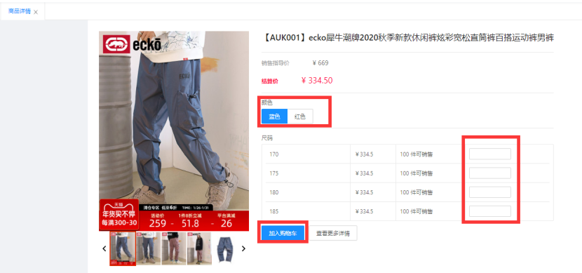 5.选择颜色,输入所需尺码的数量,最高不超过可销售库存数。点击加入购物车如果需要查看更多介绍,点击“查看更多详情”按钮,新开标签页,打开天猫平台的商品详情页。