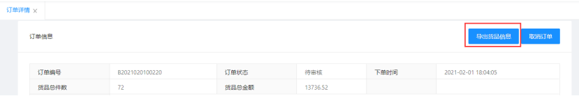 在订单详情页,可以点击【导出货品信息】按钮,导出已下单货品的产品信息。