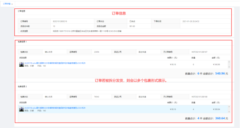 3.子订单出库后,回传运单号与发货货品明细,子单状态为“已发货”。