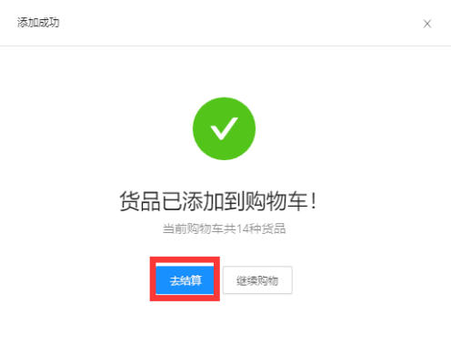 6.点击加入购物车,弹出货品加入购物车提示弹窗。在弹窗中,选择“去结算”,则直接跳转【购物车】页。