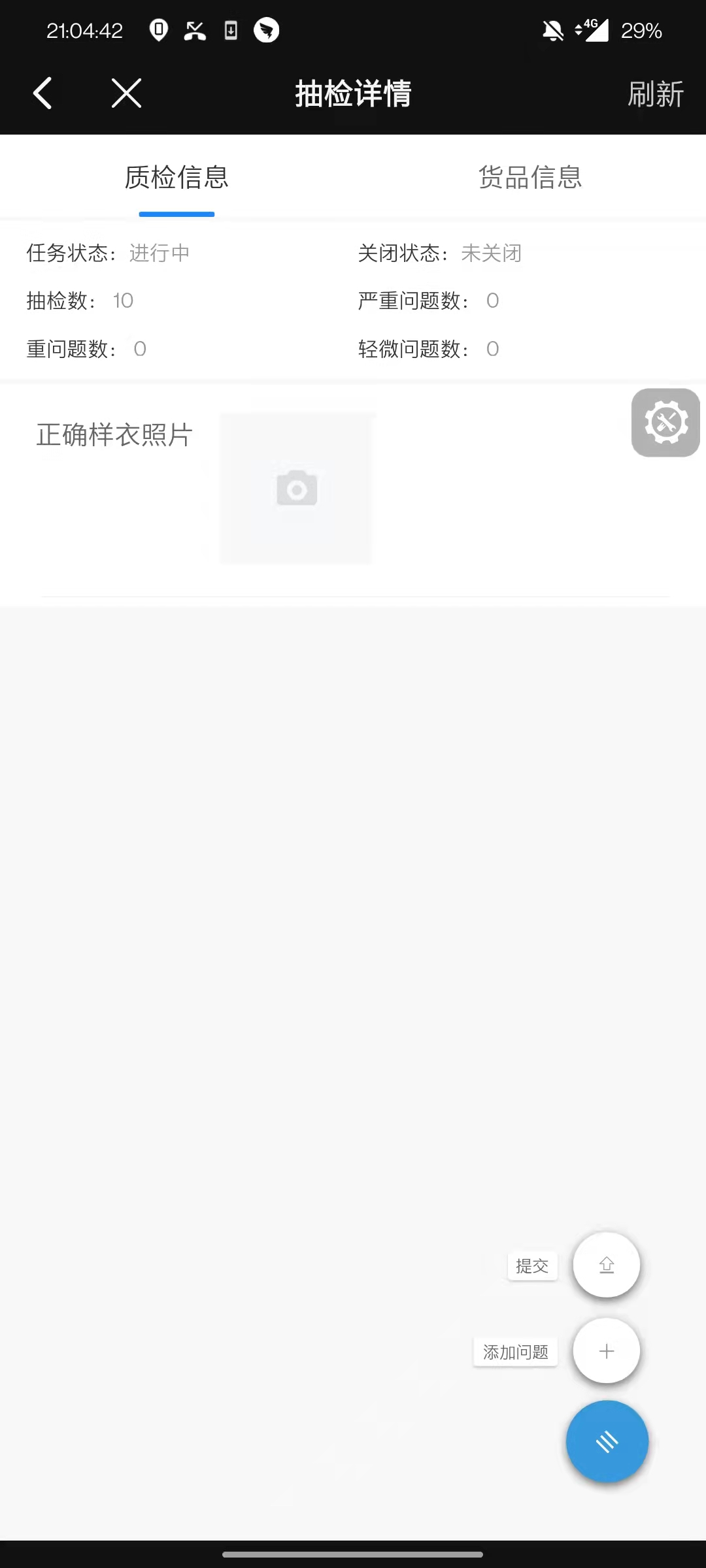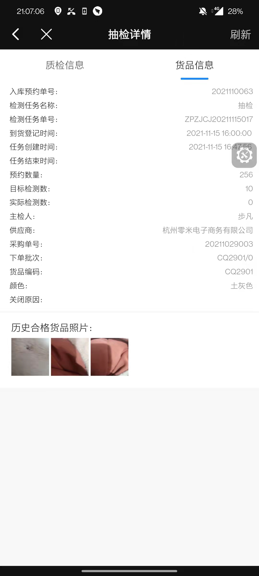 点击货品信息,若存在历史样衣照片,则可以在下方看到。若不存在样衣照片,则在质检信息中,点击”正确样衣照片”进行拍摄