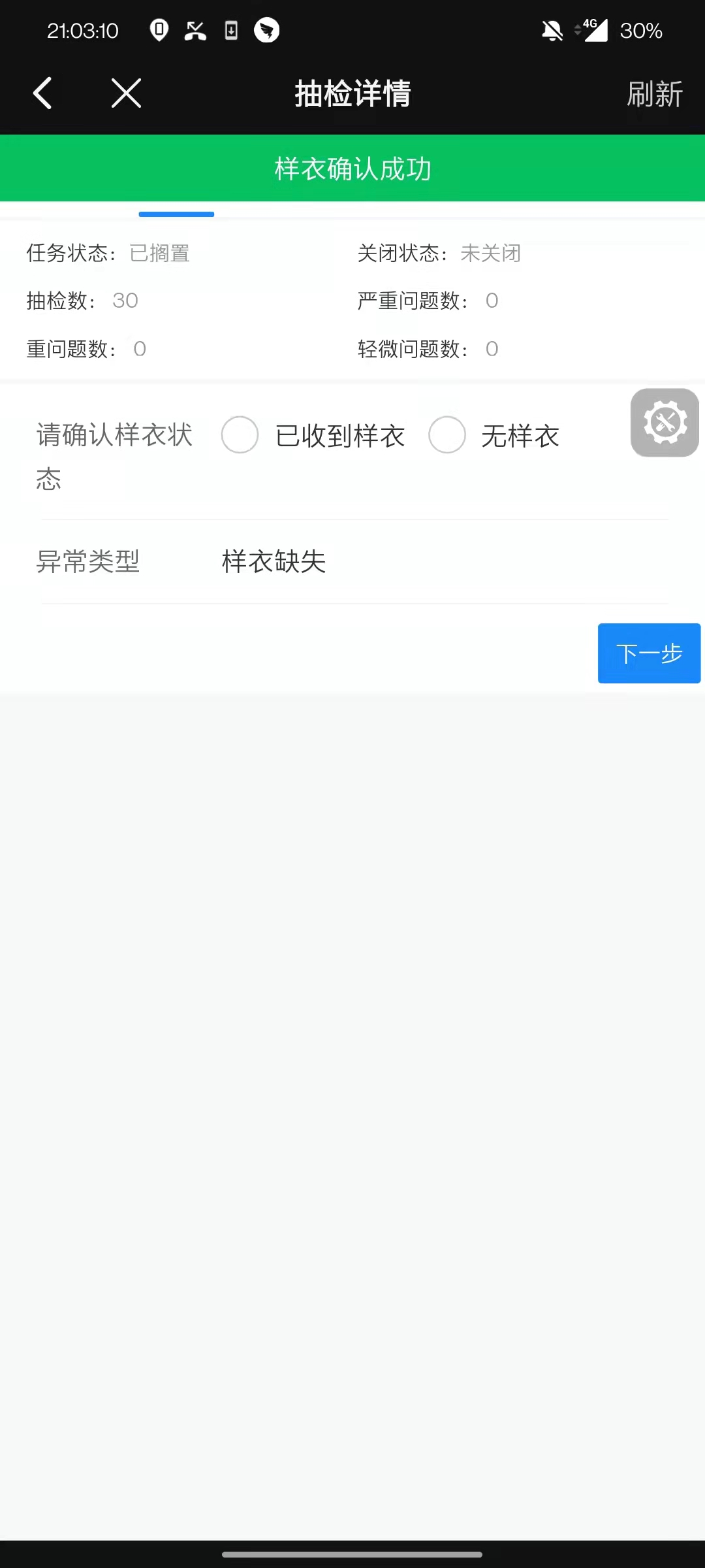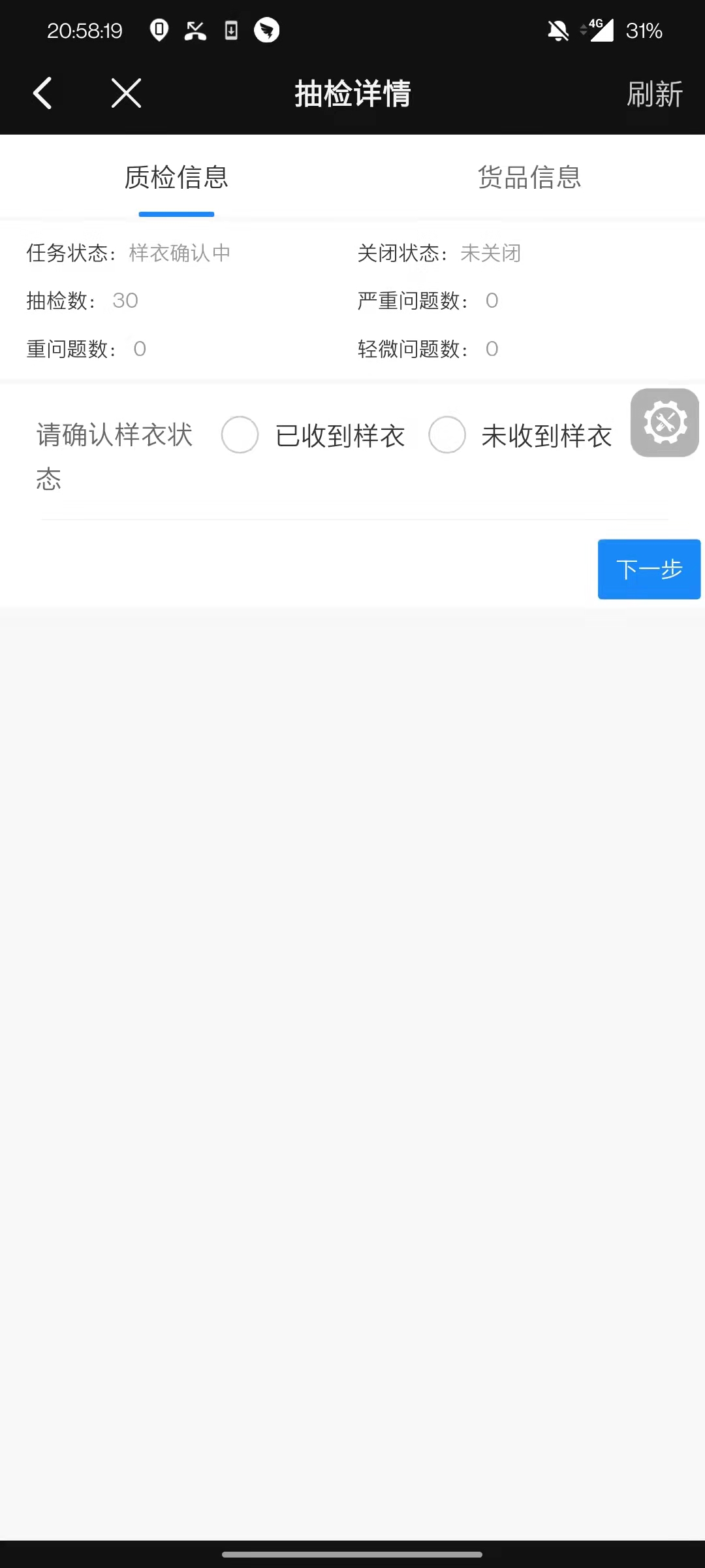 取样员根据信息,反馈给抽检员,是否存在样衣,抽检员如实填写情况,进行下一步操作。