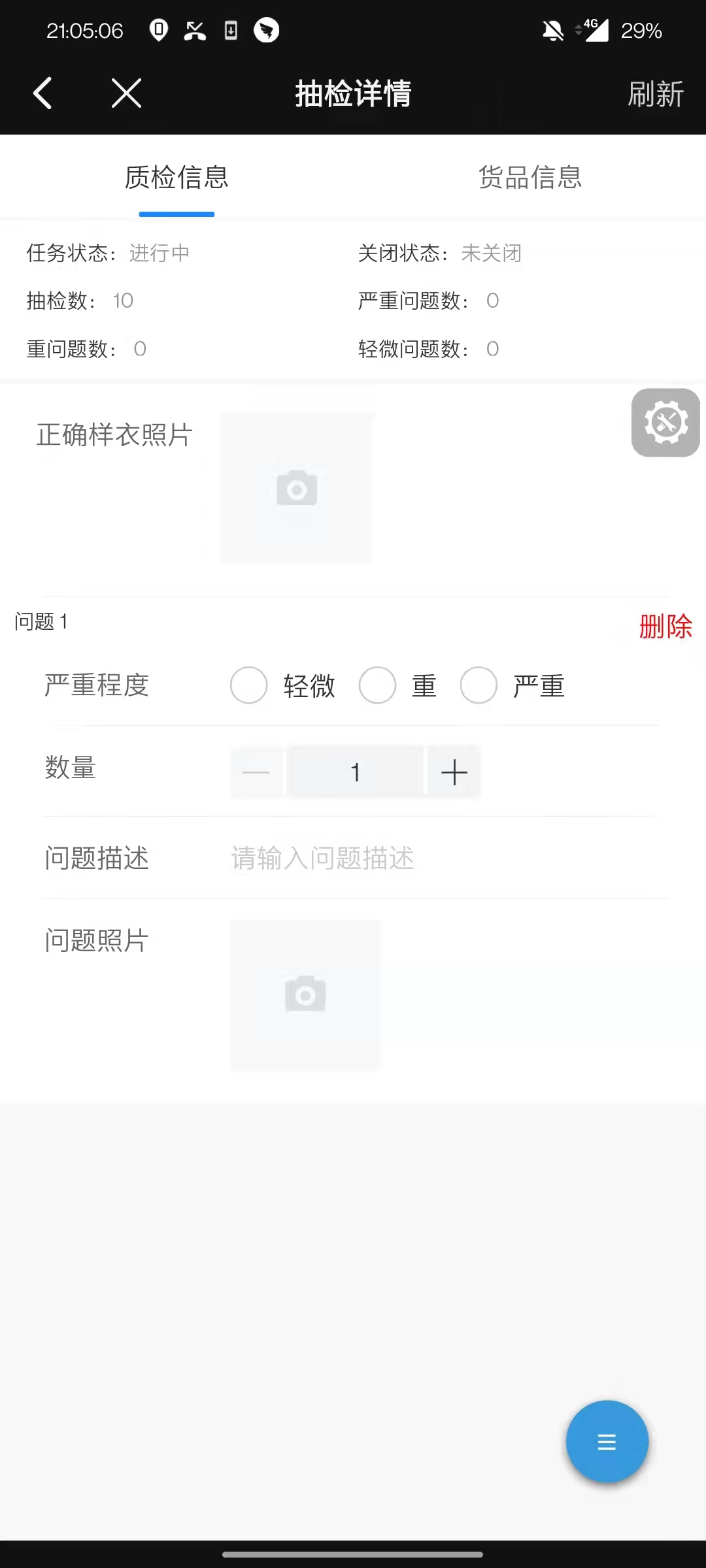 添加问题,录入严重程度,数量,描述及照片(均为必填项),完成后,即可提交或继续添加问题。