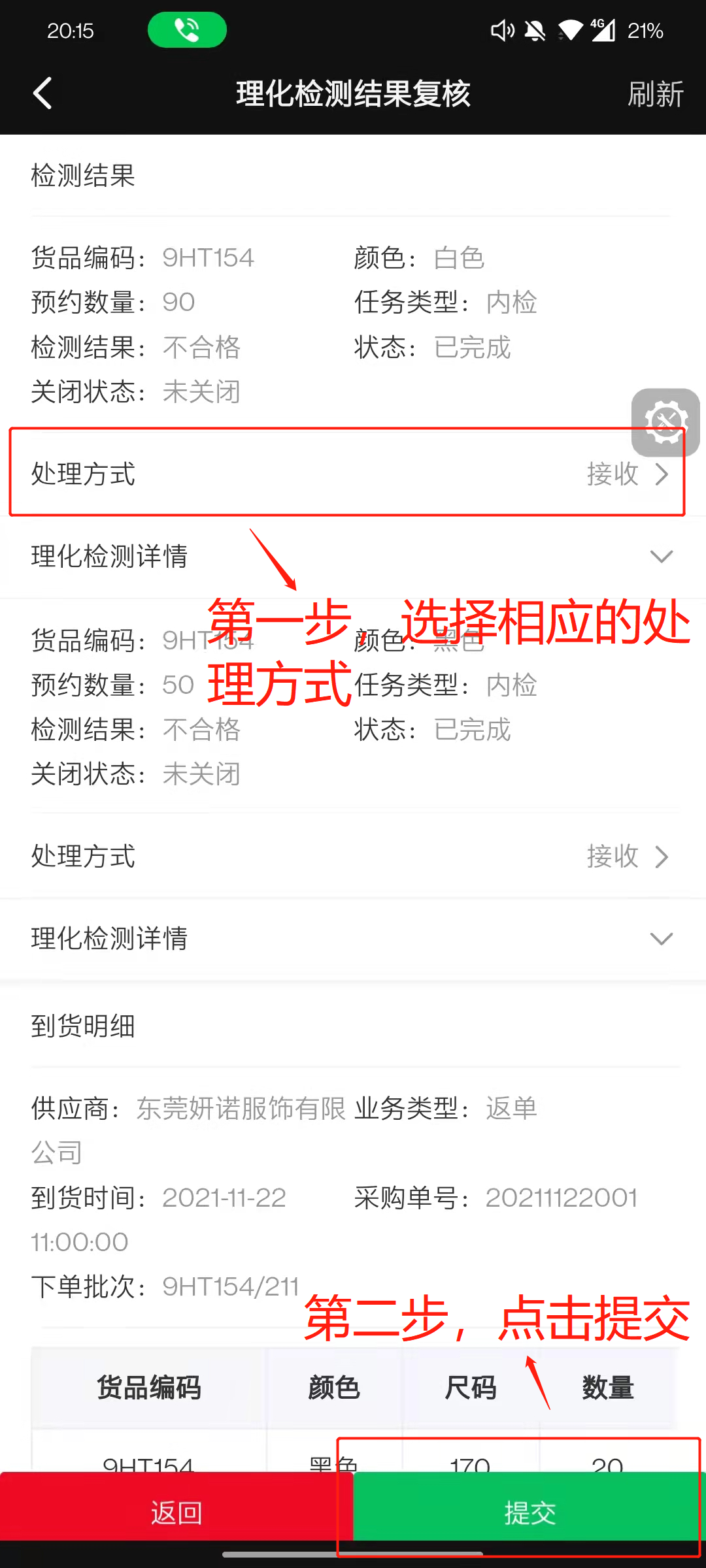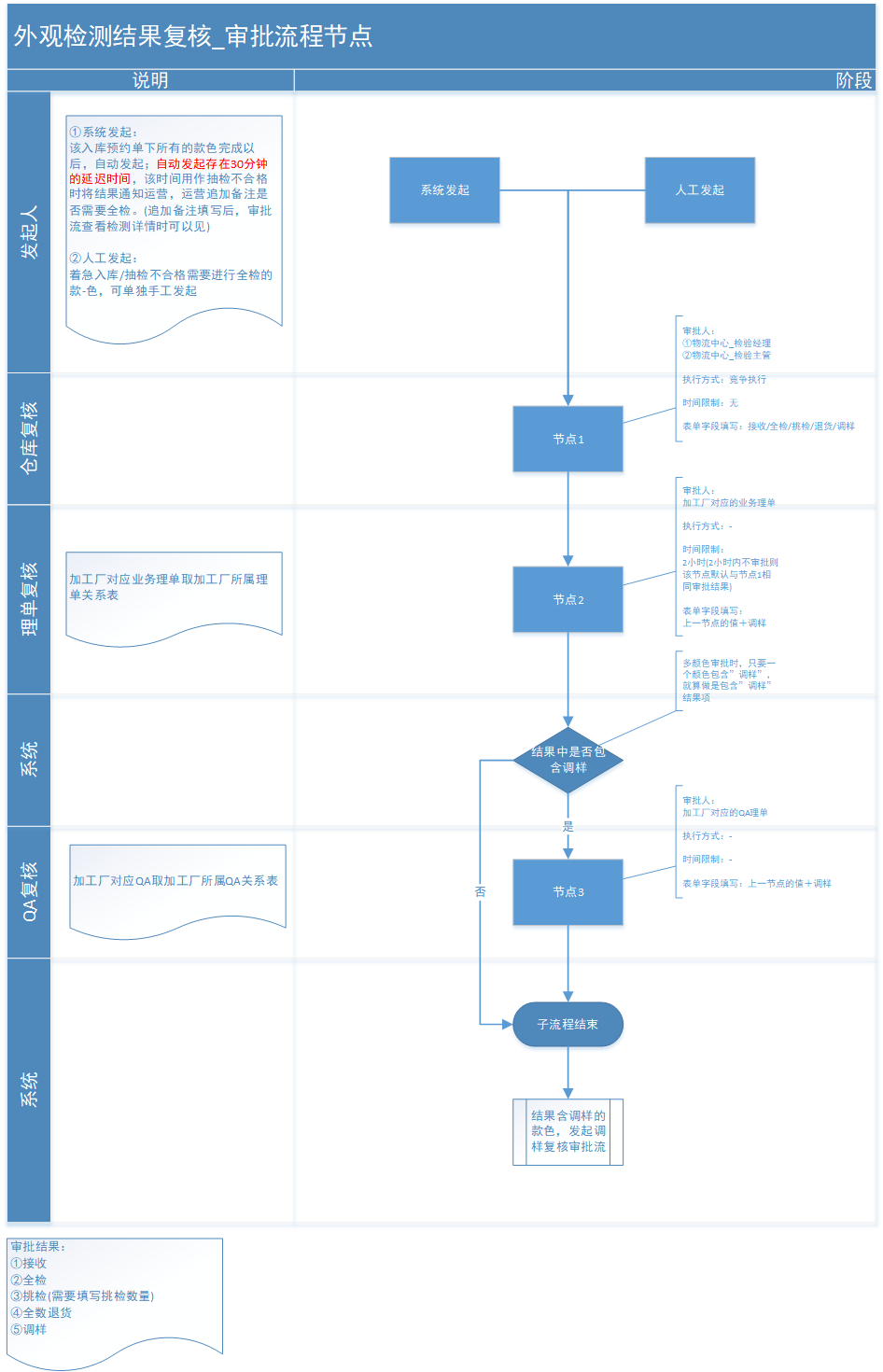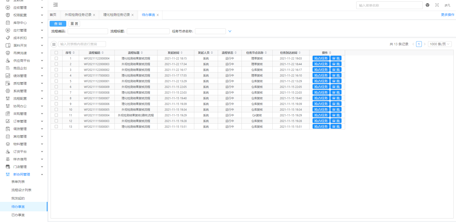 当成品质检任务下的所有款-色都已完成外观检测(抽检&全检)或理化检测时,系统会在30分钟后自动发起外观/理化接收结果复核审批流,该审批流将包含该成品质检任务下的所有款-色。