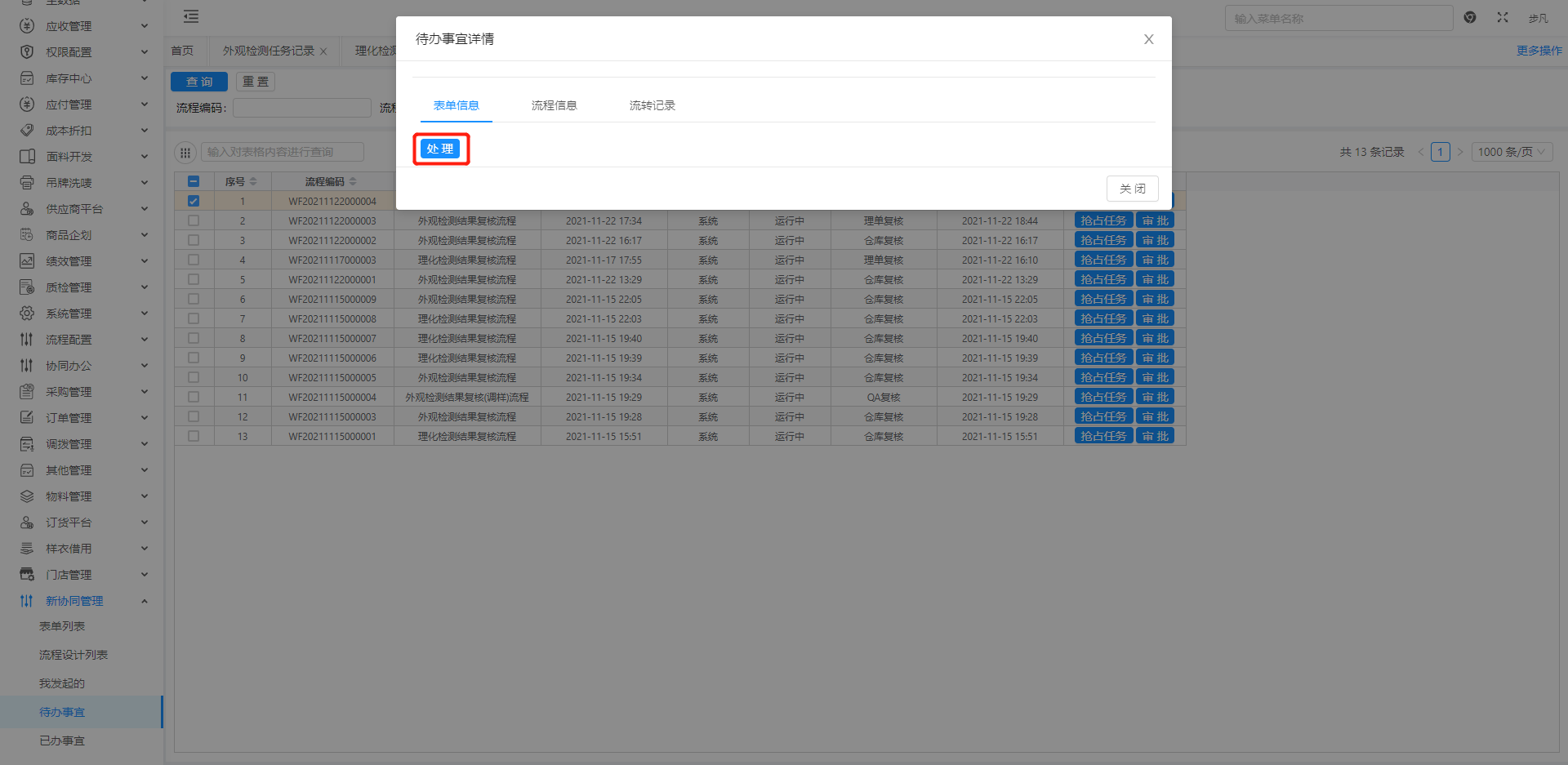 选择需要审批的流程,点击”审批”,在弹出的弹窗点击”表单信息”Tab下的”处理”按钮