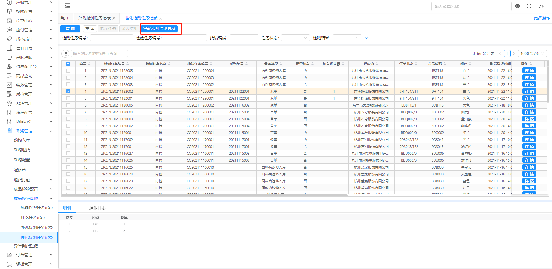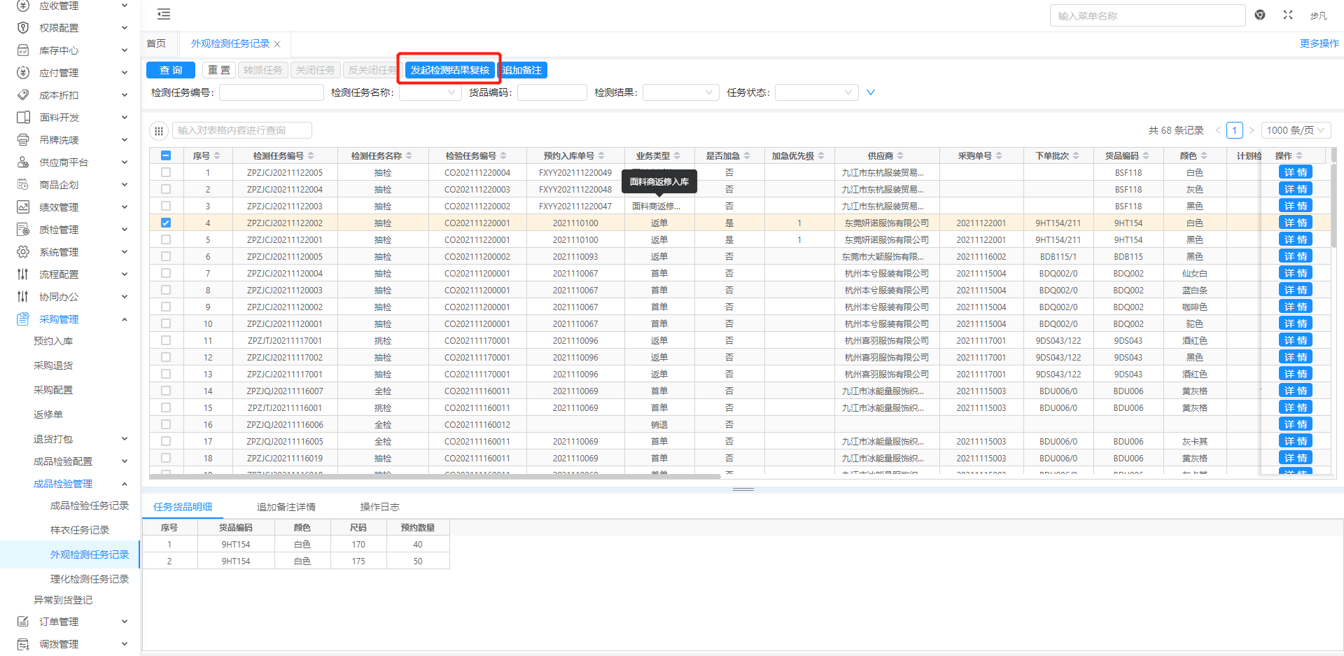 功能入口:[采购管理→成品检验管理→外观检测任务记录→发起检测结果复核]