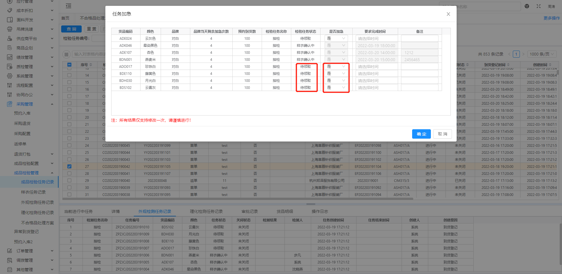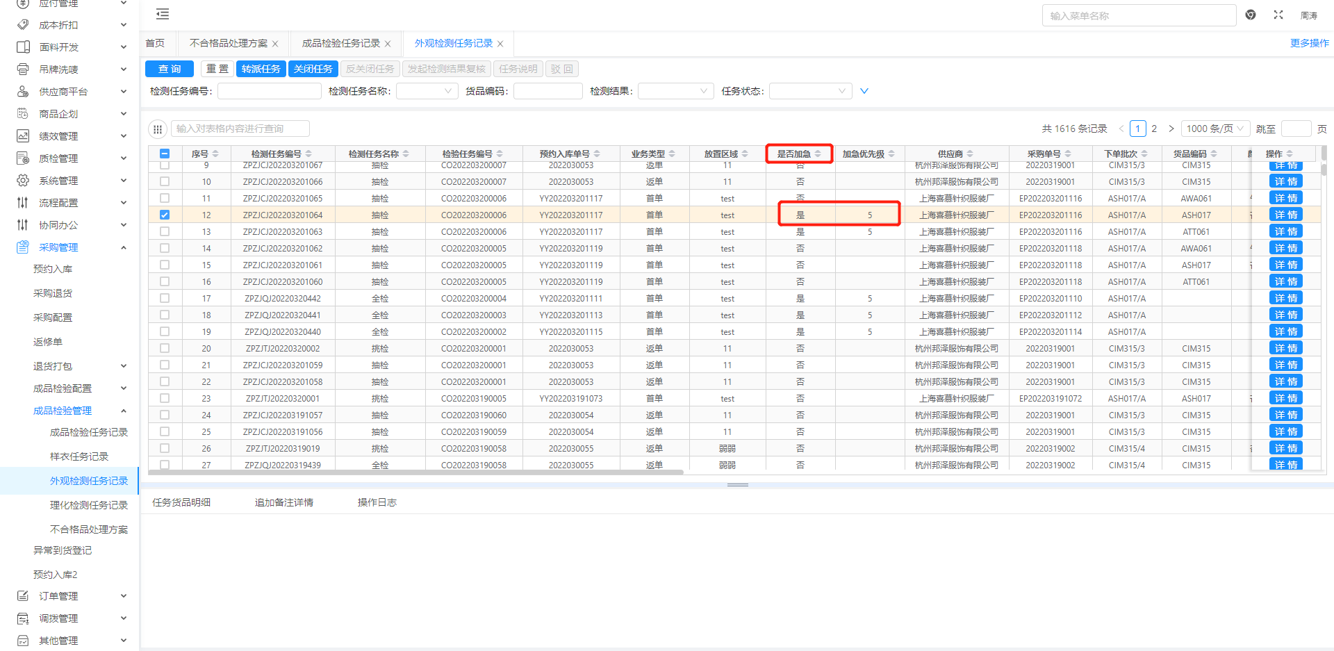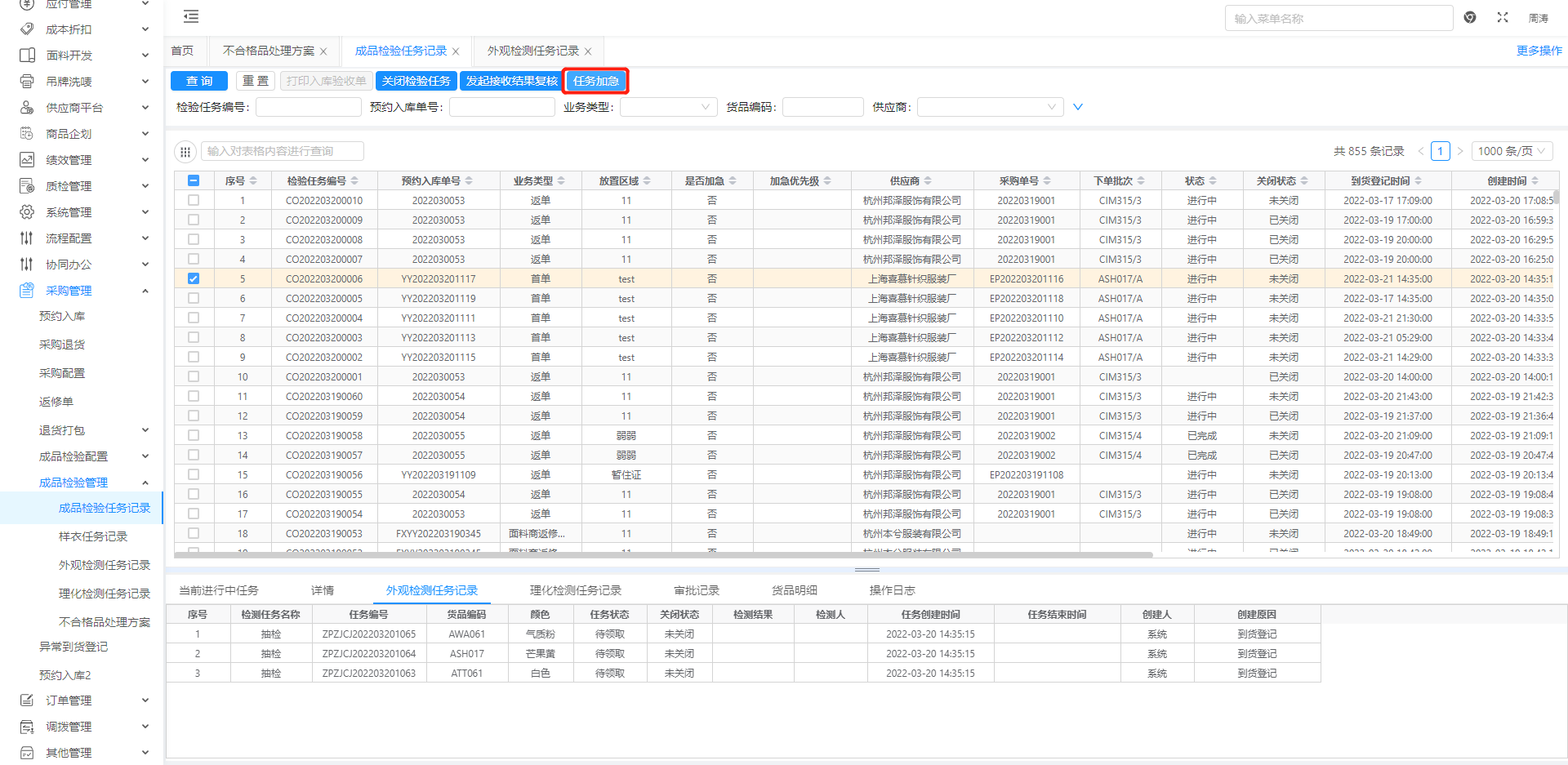 在[成品检验管理→外观检测任务记录]中,查询需求入库预约单-款-色对应的外观检测任务,若”是否加急”字段为”是”,则已加急成功。