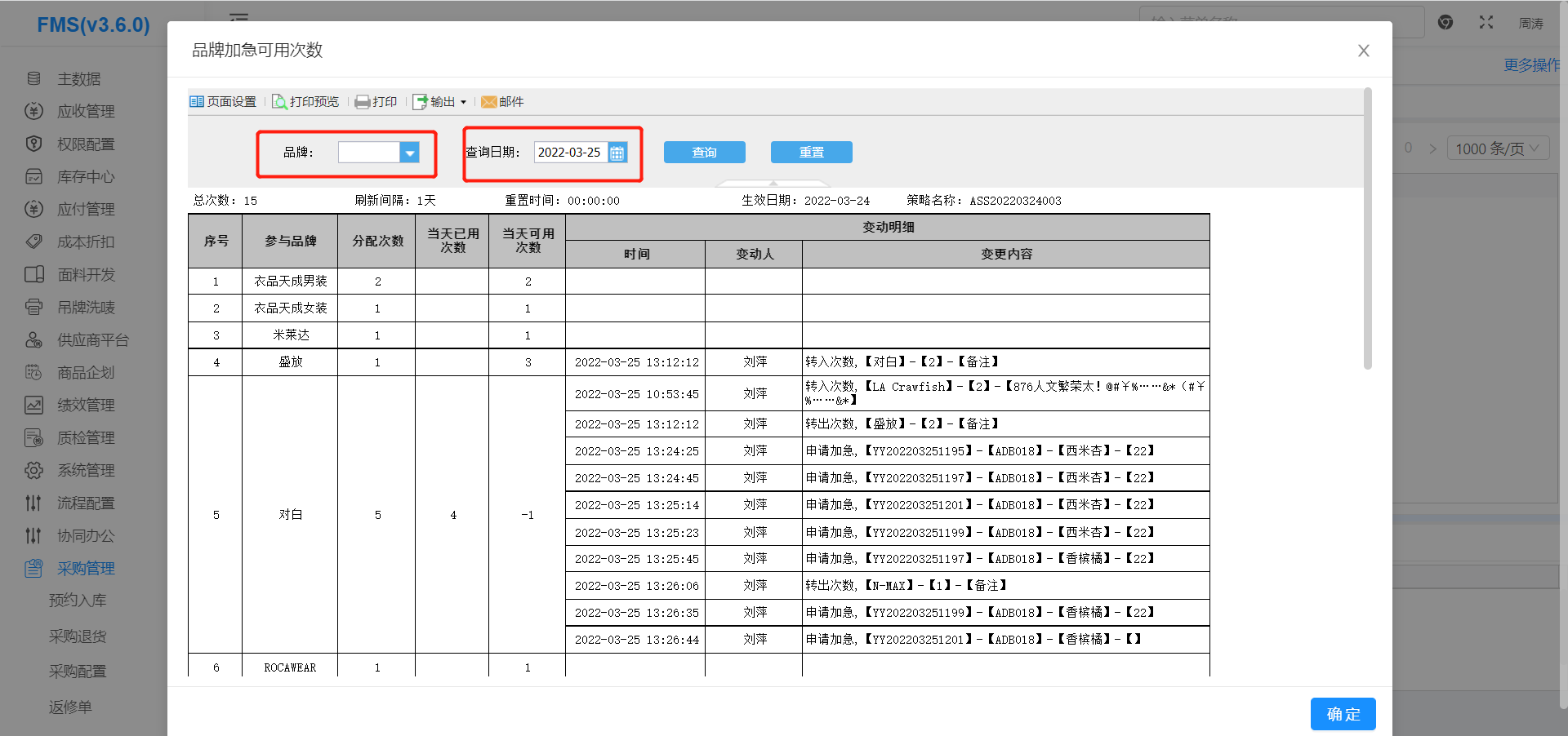 位置:成品质检配置_申请加急次数配置,点击”修改本期次数”按钮;选择对应的转出与转入品牌,填写次数即可;次数会在下个刷新间隔后重置;