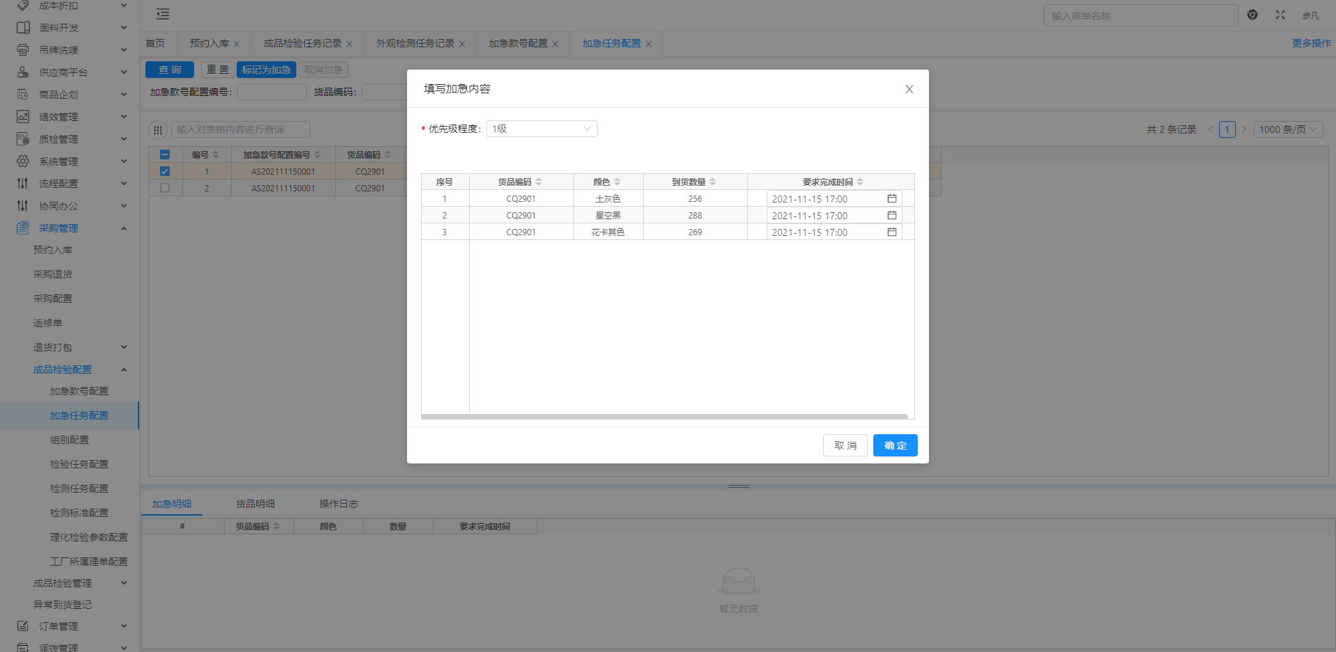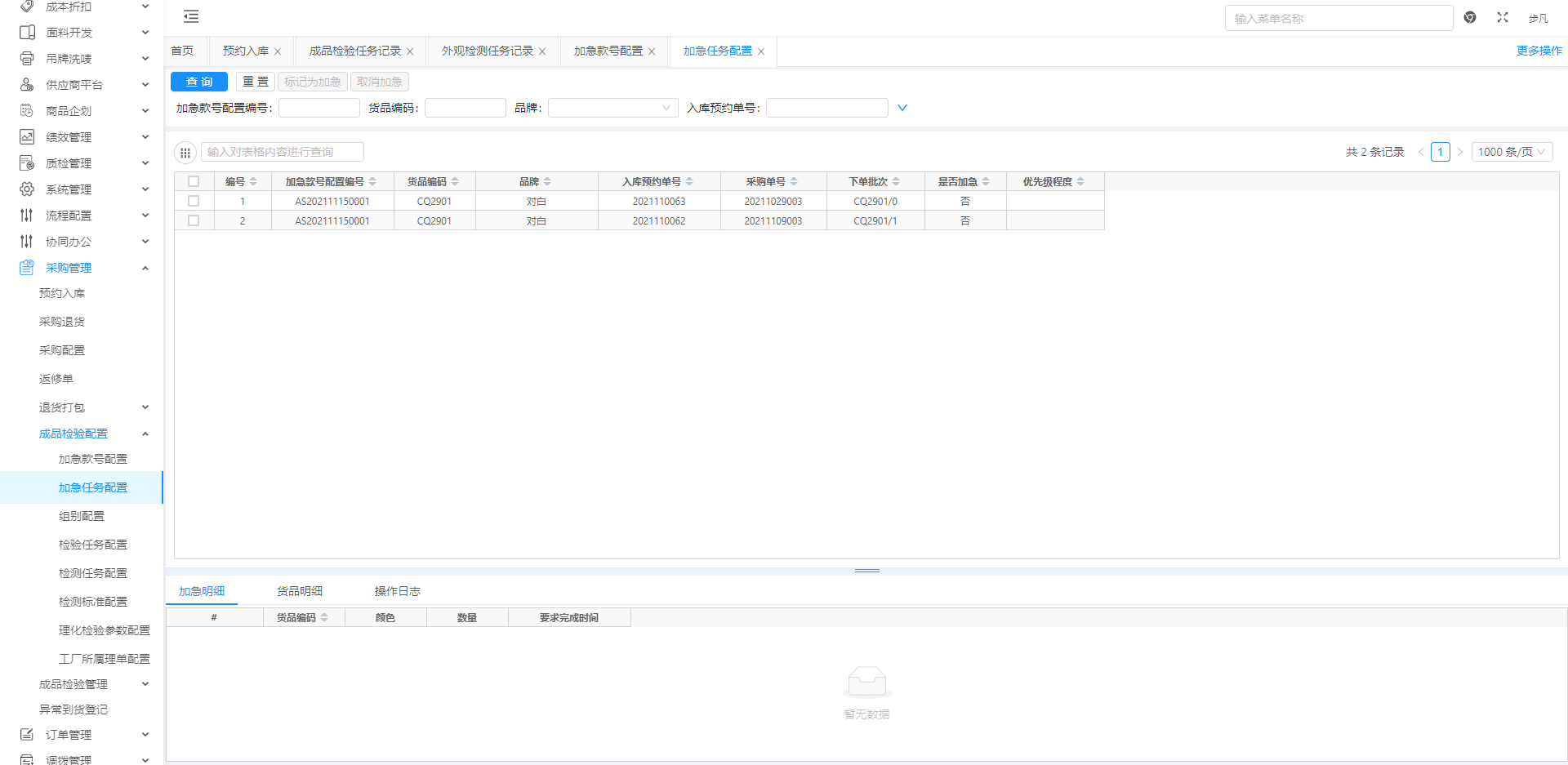 第二步:第一步操作完成后,在[成品检验配置→加急任务配置]中,系统会根据上一步填写的大货款号、有效时间段等信息,自动同步该时间段内,包含该大货款号的采购入库预约单。(时间到期后,不满足条件的入库预约单会自动清除)