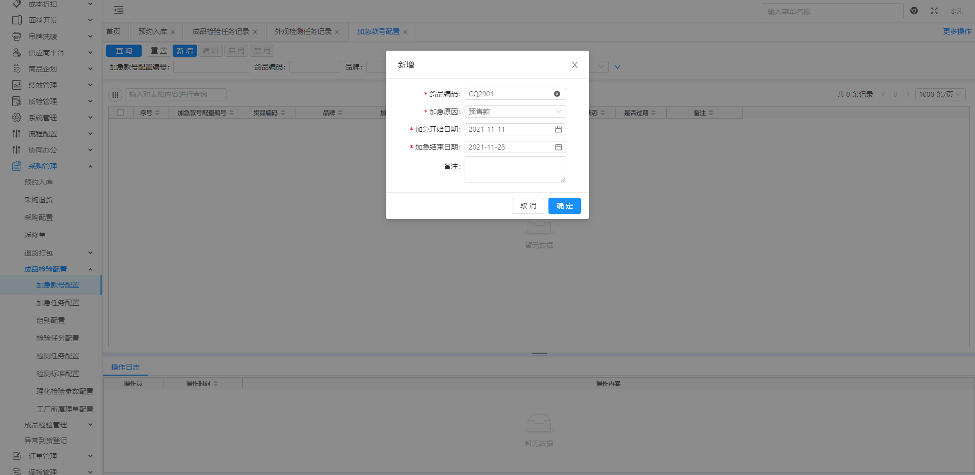 第一步:先在[成品检验配置→加急款号配置]中,填写需要加急的大货款号,并选择需要加急的时间段。