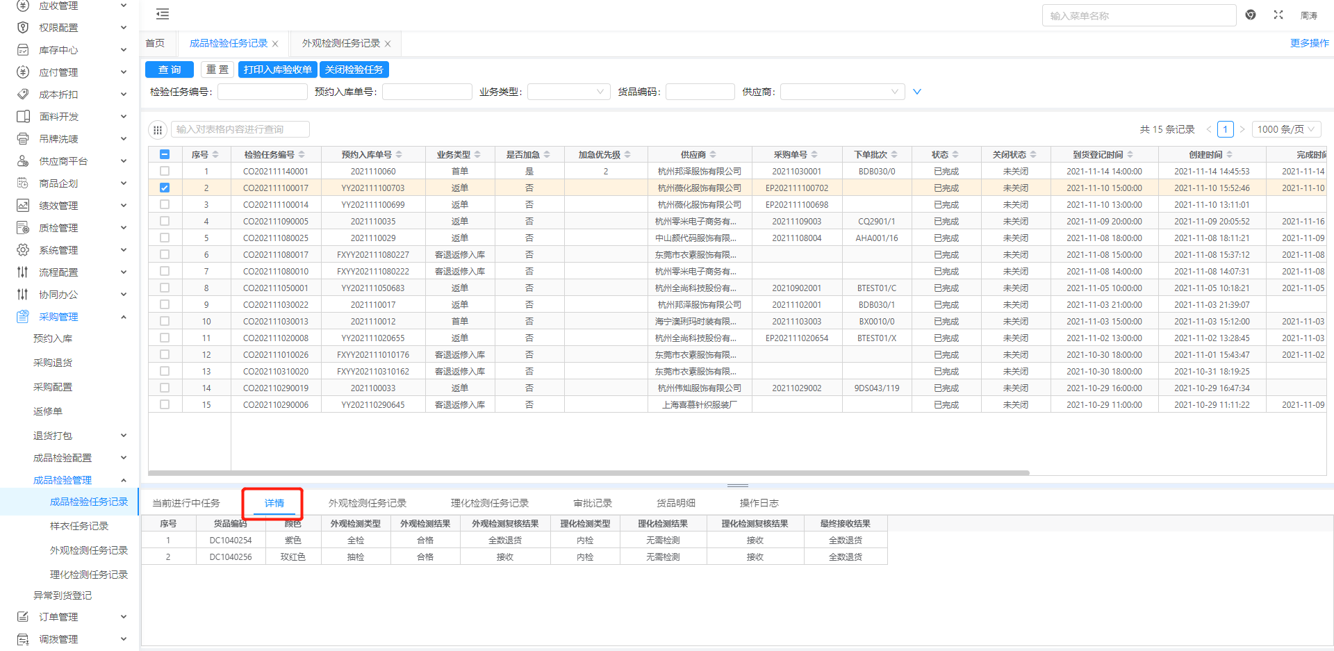 1.PC端查询质检结果功能路径:[采购管理→成品检验管理→成品检验任务记录]选中一条数据,点击后即可查询其子表。其中,”详情”子表记录了每一个款色相应的检测结果及审核结果(如果没有配置相应的审批流,则对应审批流的结果为空) 2.手机端查询质检结果功能路径:[检验任务结果]文档更新时间: 2024-11-13 10:24 作者:步凡