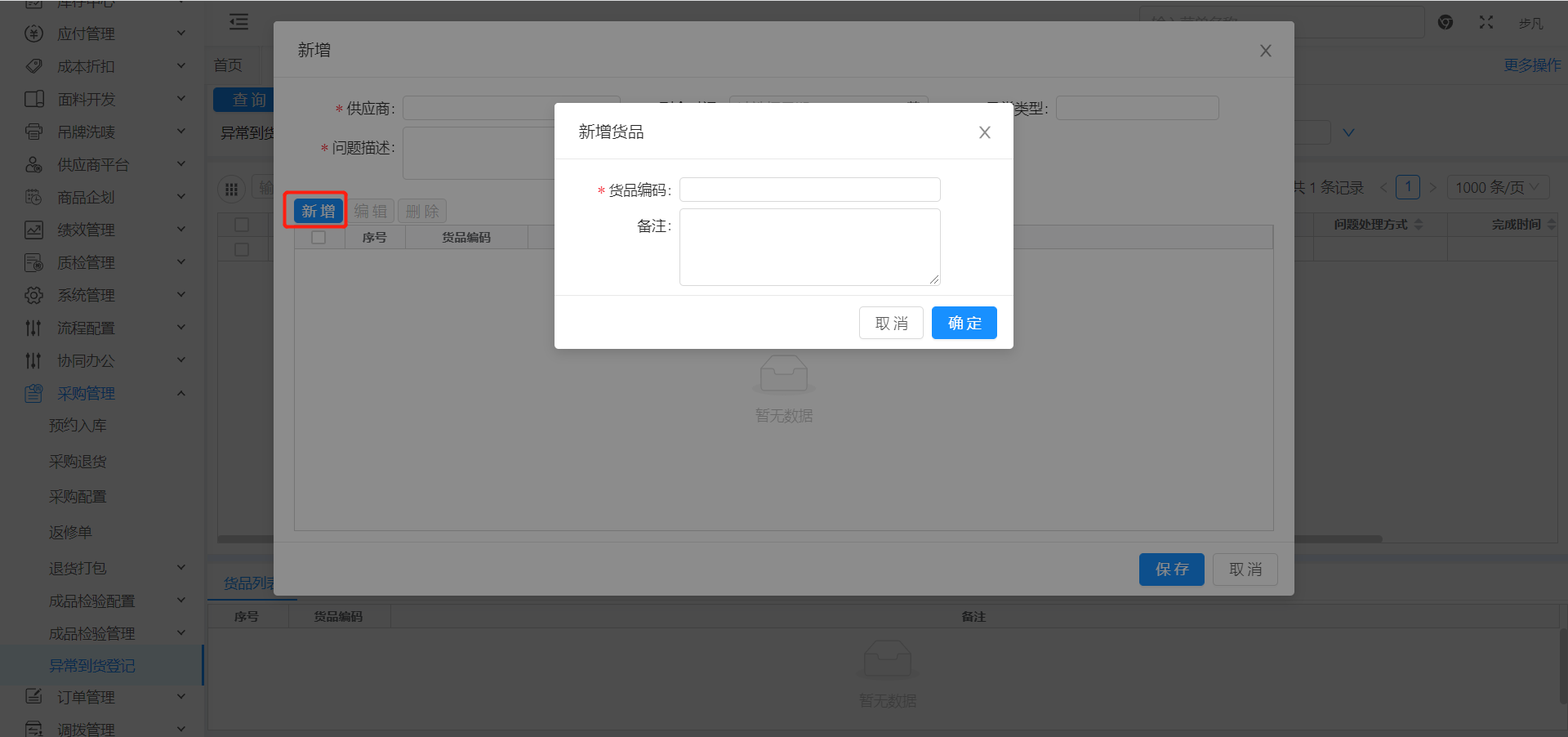如果需要填写大货款号等信息,点击”新增”进行新增货品的操作。
