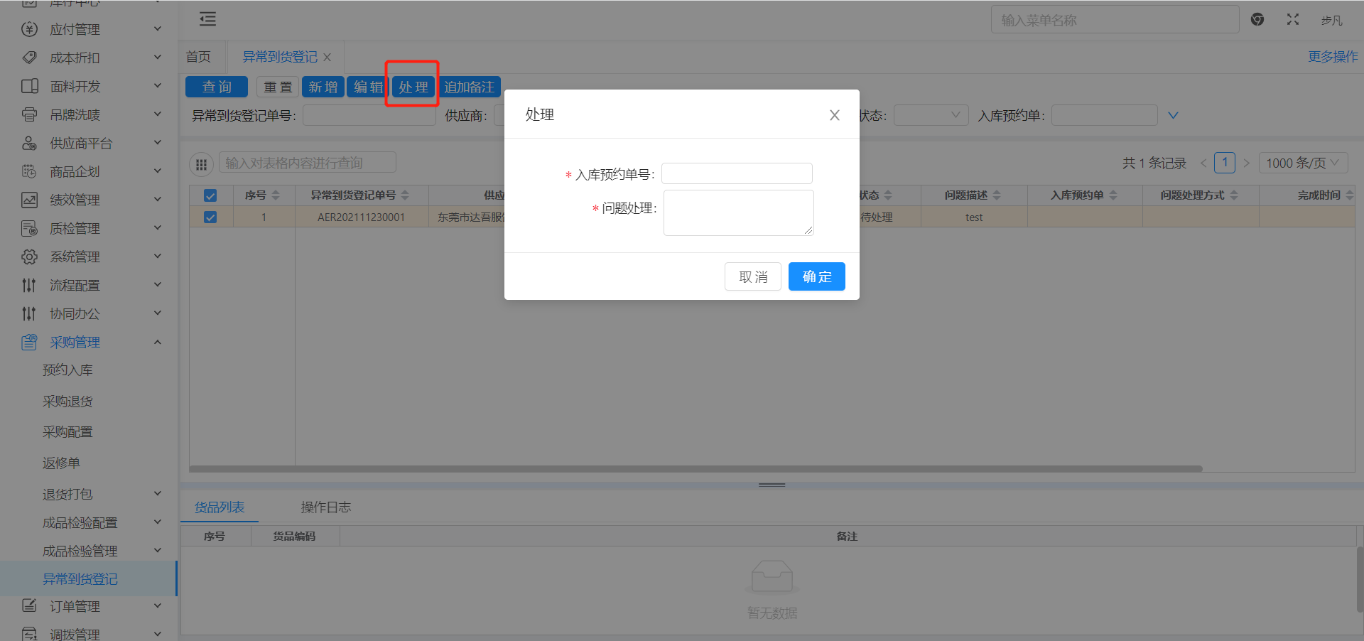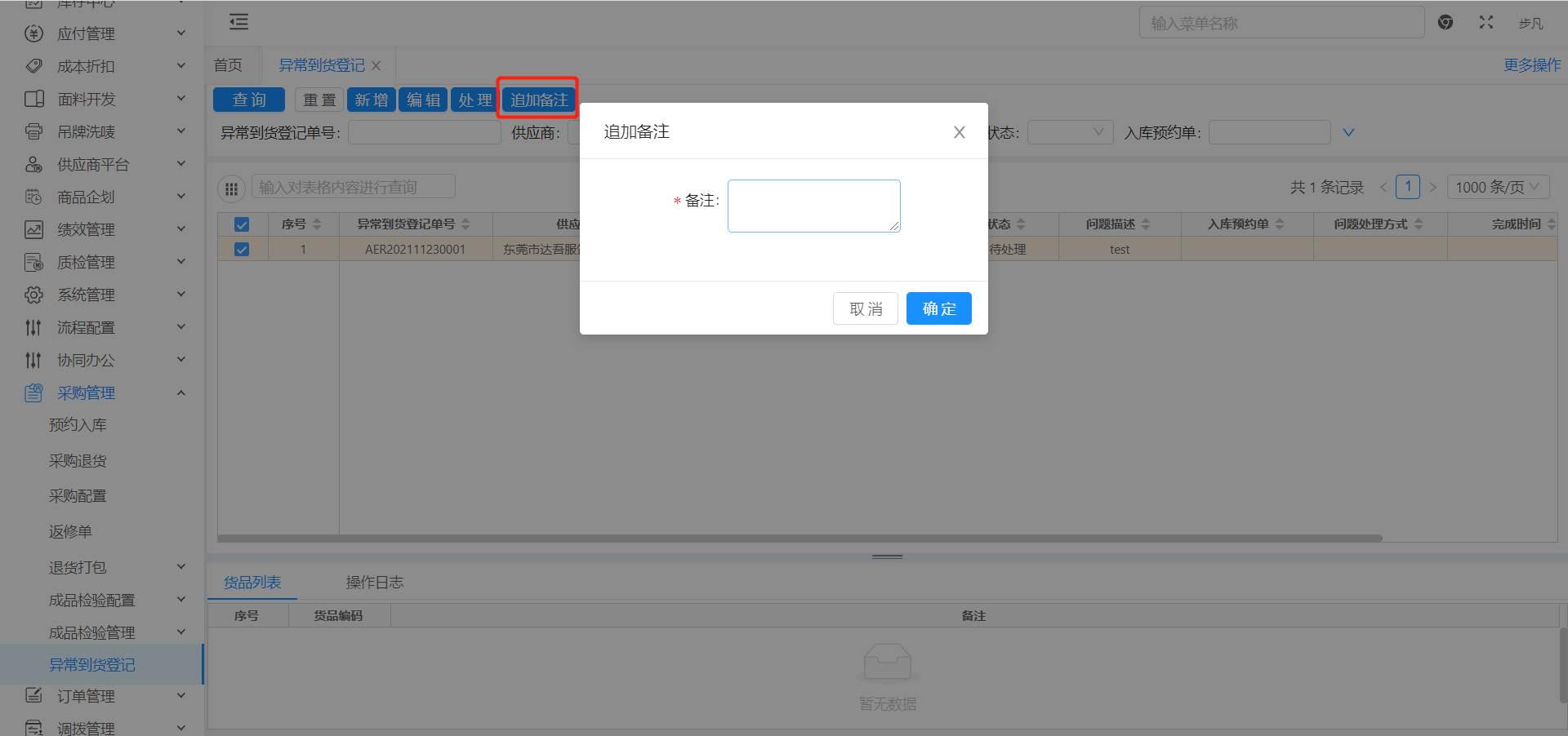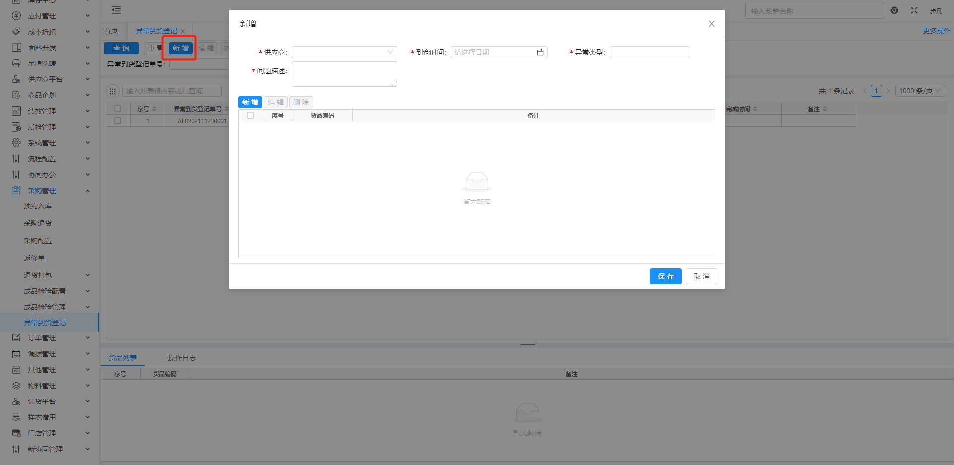 路径地址[采购管理→异常到货登记]