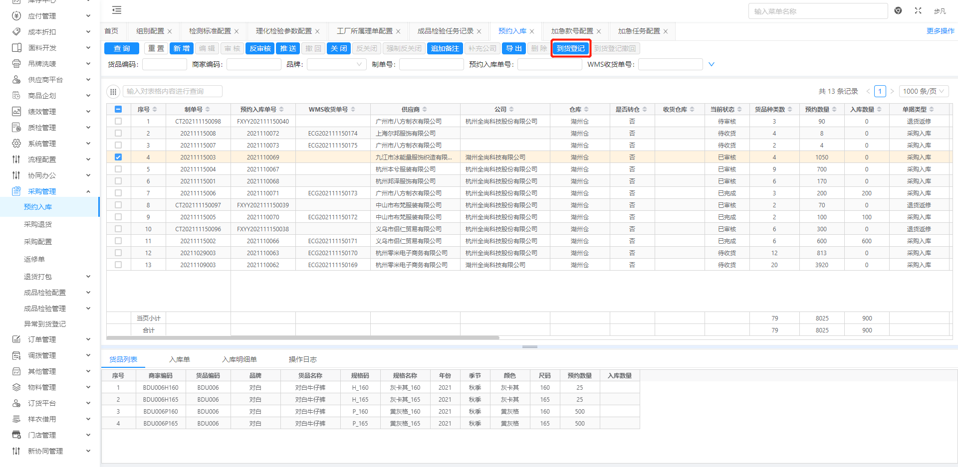 注:到货登记成功时,会自动将入库预约单推送至WMS。