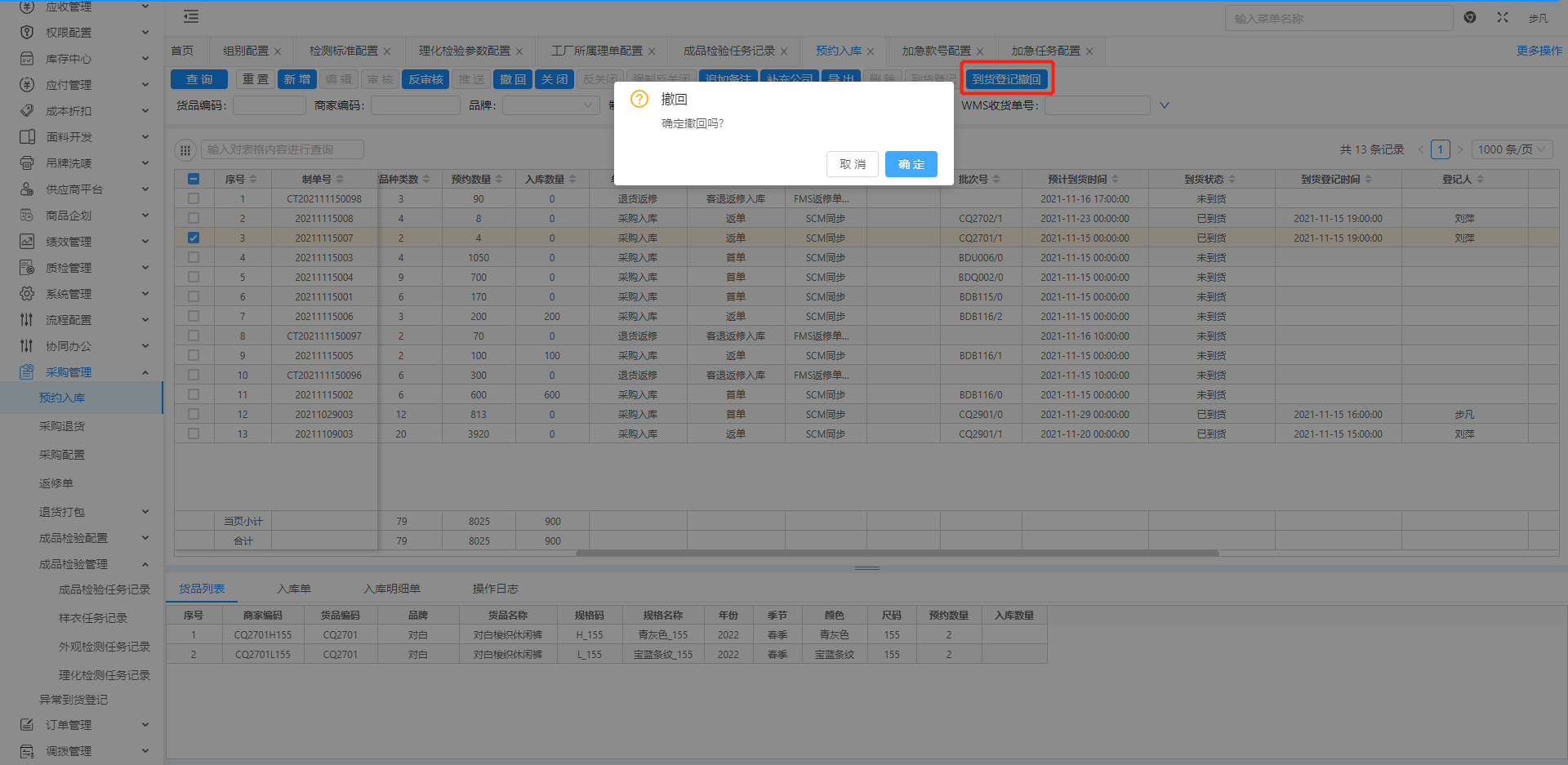 注:到货登记撤回时,需要关闭正在进行的成品检验任务。若成品检验任务已完成,则无法撤回。(已经开始收货的入库预约单无法撤回)