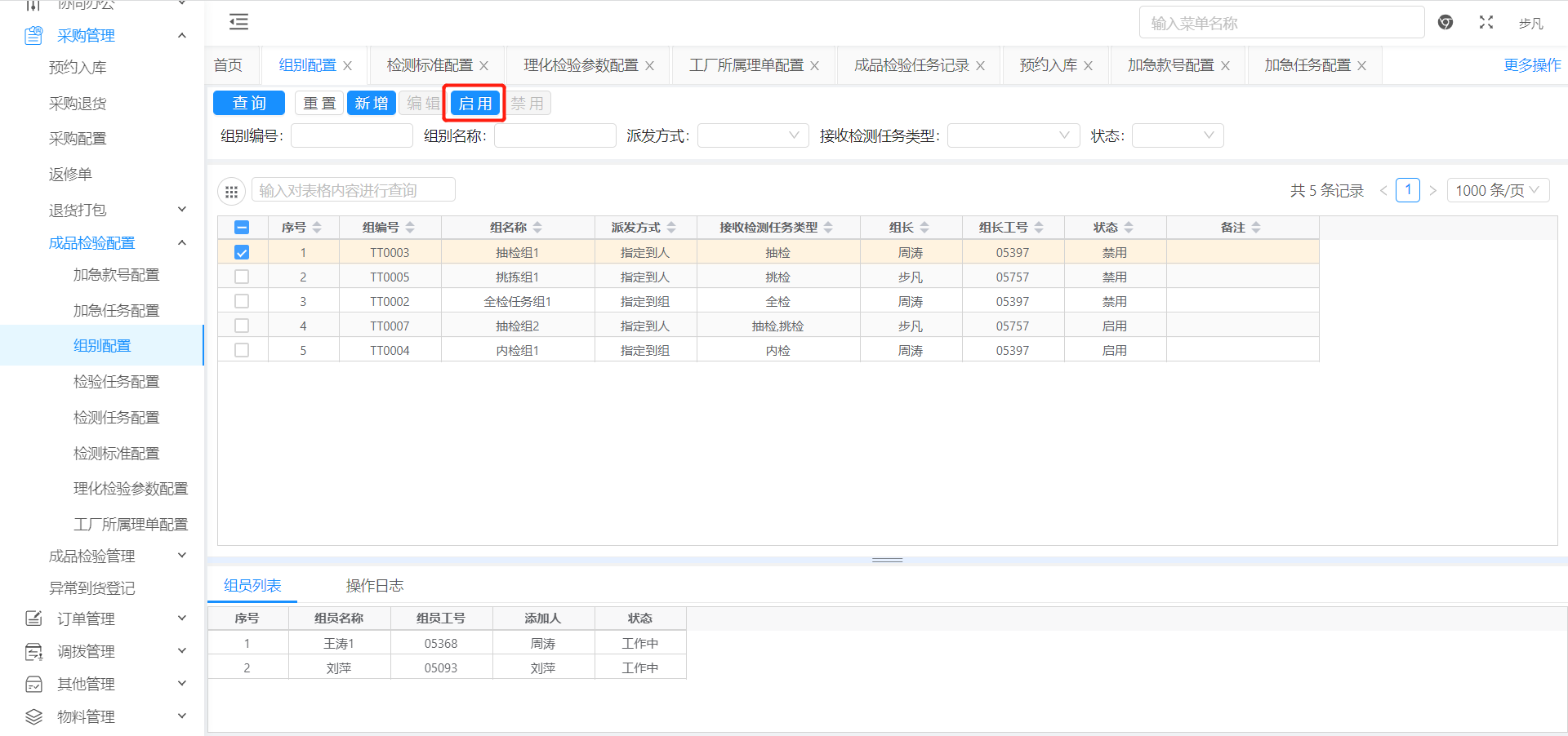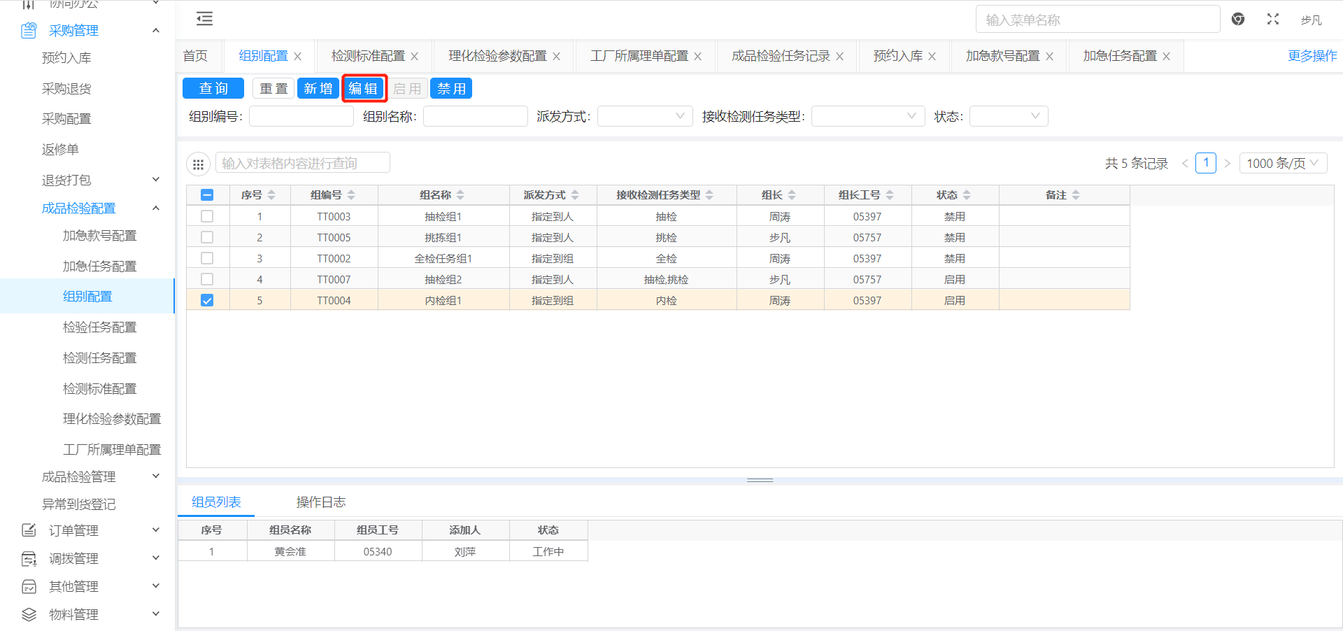 添加组员:添加理化内检组的所有组员