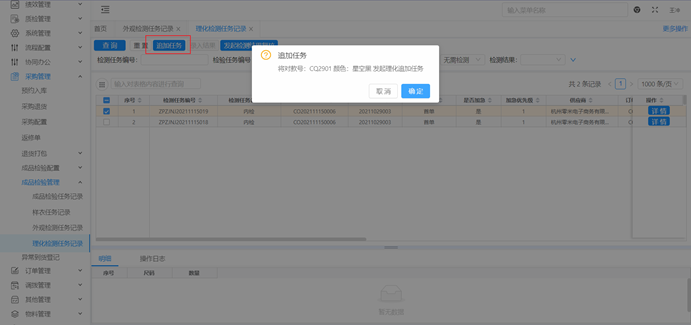 同一个采购单下,若款+色的维度已存在理化质检为合格的记录,此时新的预约单进来后会自动创建一条状态为【无需检测】的理化质检任务。若要追加检测,此时选择状态为【无需检测】的质检任务,点击【追加任务】按钮,点击确认后,当前任务的状态会从【无需检测】变成【待领取】。