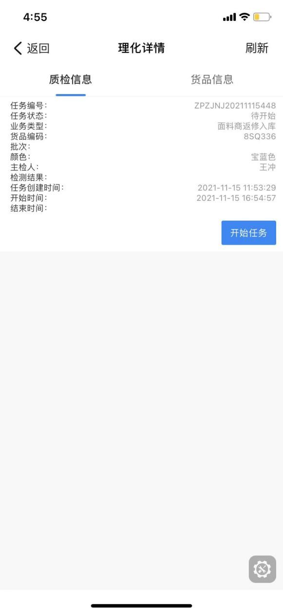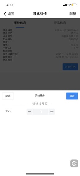 选择状态为【待开始】的理化质检任务,进入理化详情页。点击【开始任务】按钮后出现下图弹框,选择当前款号+颜色下参与理化质检的尺码以及尺码对应的数量。点击【确认】后,理化质检任务从【待开始】状态变成【进行中】。