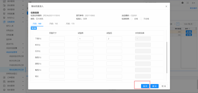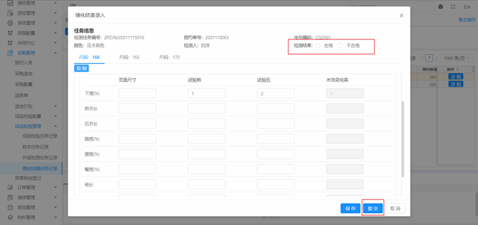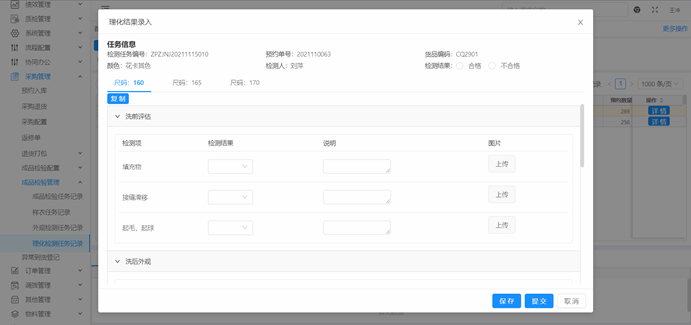 选择正确的检测人后进入到理化结果的录入界面,在这边可以看到,任务开始时选择的尺码,在录入结果时都需要填写对应的“洗前评估”、“洗后外观”、“水洗尺寸变化率”。