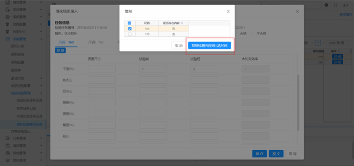 在录入完其中一个尺码的质检内容后,点击【复制】按钮可将当前尺码的质检内容复制到勾选中的尺码页面,将被复制尺码界面原有的内容进行覆盖