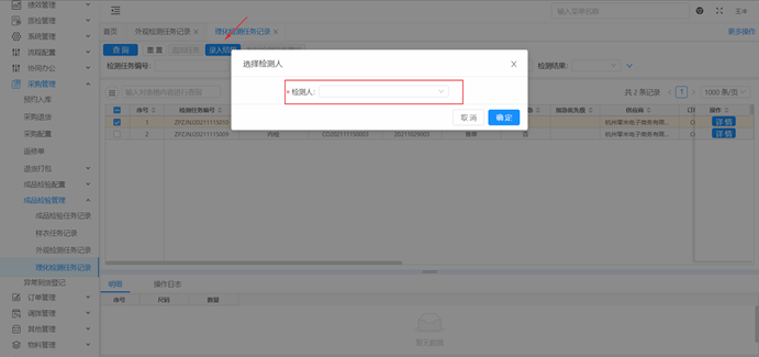 理化质检的录入是在PC端操作,界面为【理化质检任务记录】。选择对应的理化质检任务后点击【录入结果】。此时会弹出一个检测人的确认框,需要选择当前任务归属的检测人才可进一步操作结果的登记。