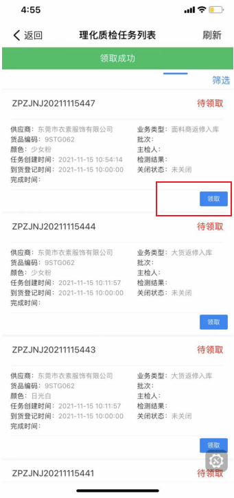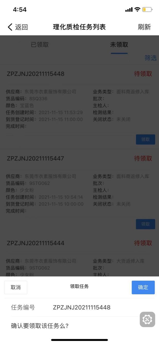 理化任务需求由理化组组员自行领取,为竞争制。在【理化质检任务列表】界面,点击【领取】按钮进行任务的领取。任务状态会从【待领取】变为【待开始】。