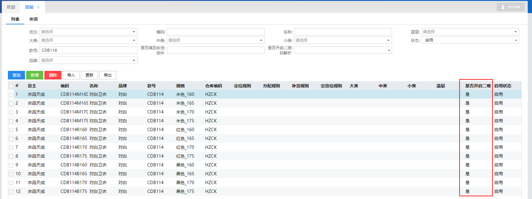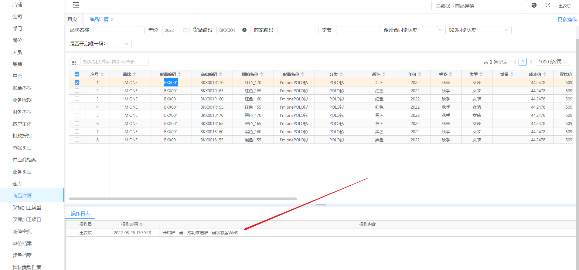 1.1 在SCM下的首单或者返单审核成功后,来到FMSL>>商品详情页面,搜索大货款号,点击启用唯一码,该款商品商品就会启用,入库时必须将合格证上的妈跟洗唛码绑定成功才可入库