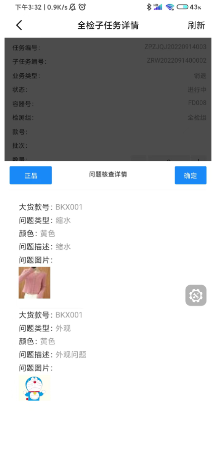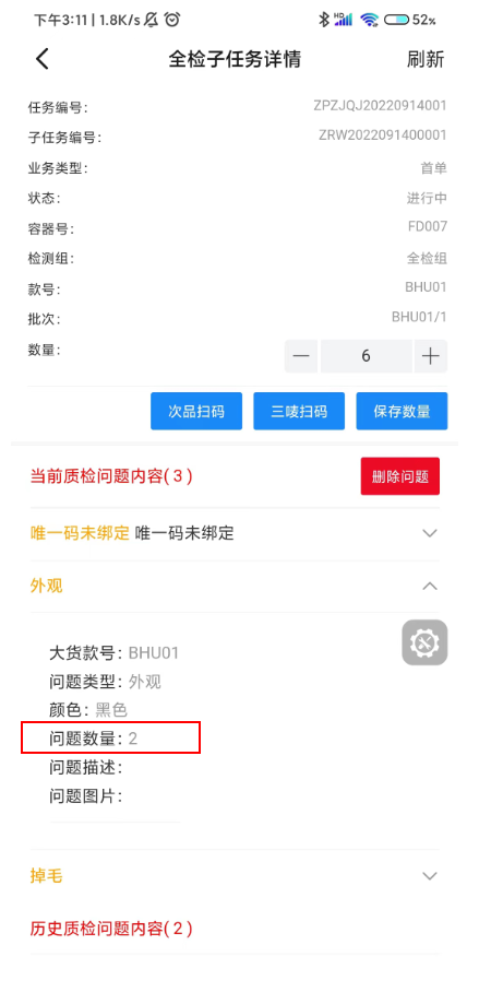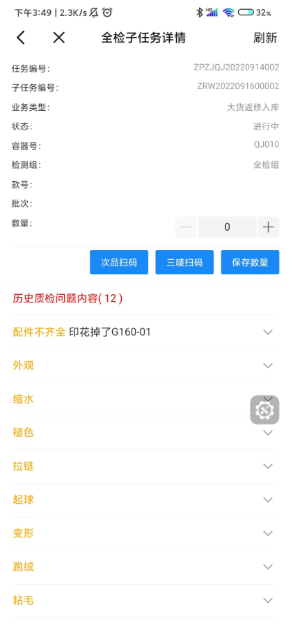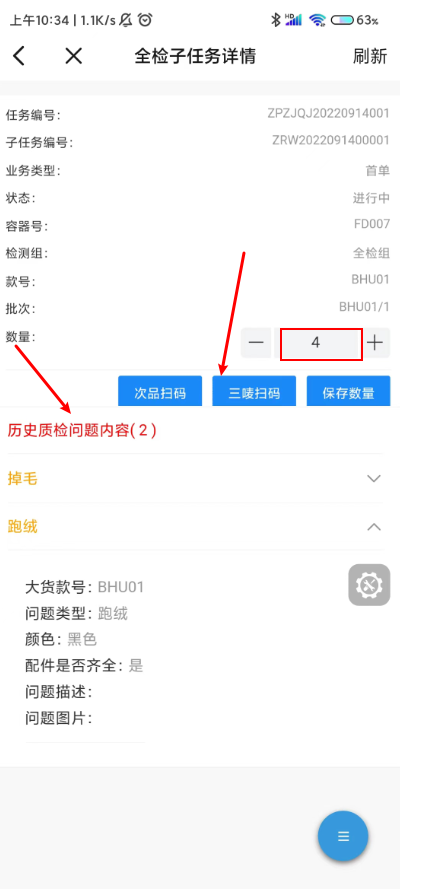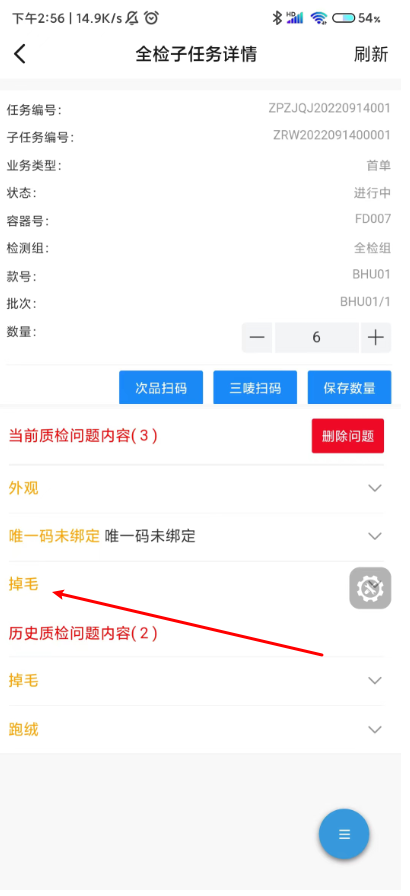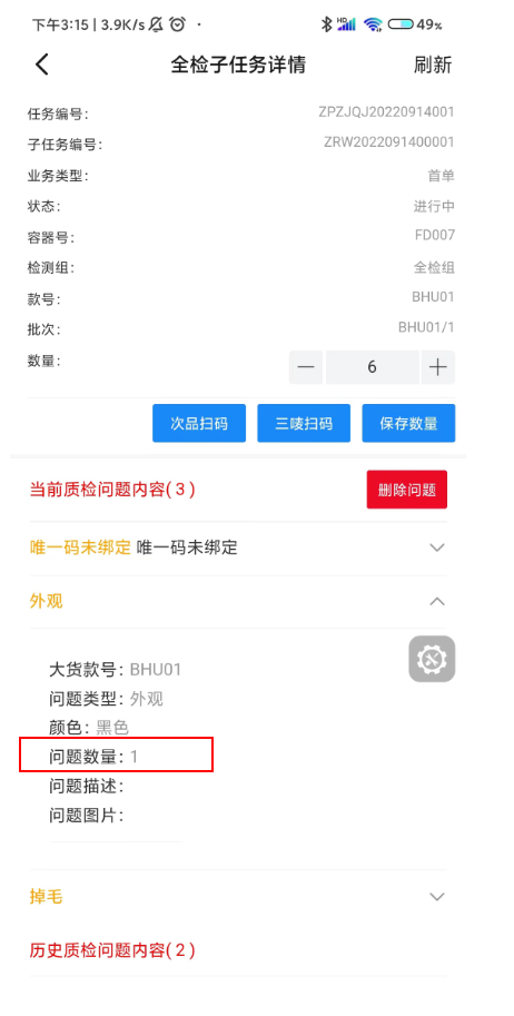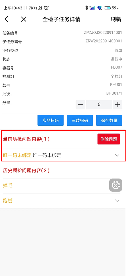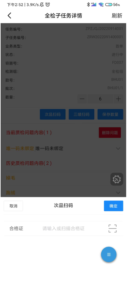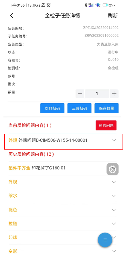 1.3 点击次品扫码,扫描合格证,添加问题