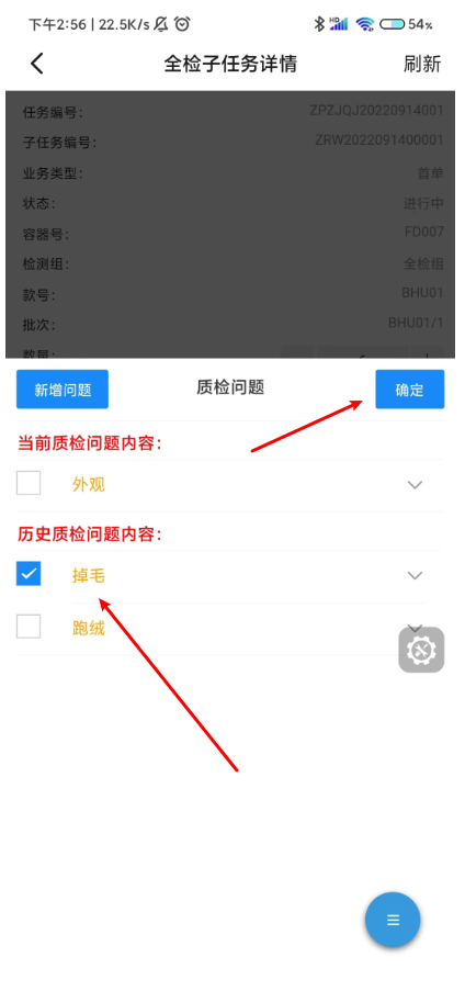 三唛扫码之后会展示上次质检问题,勾选问题,点击保留,会添加到当前质检问题里面