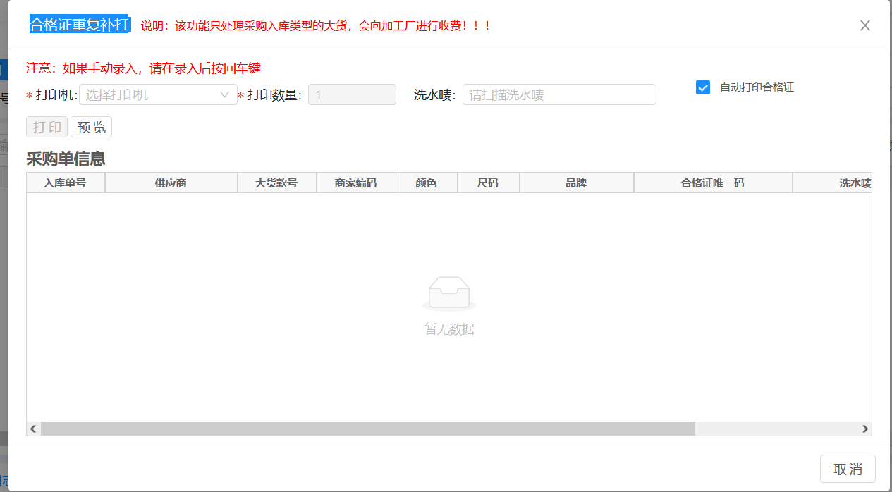 1、该功能仅试用于采购入库收到大货出现唯一码和合格证的异常问题,样衣退货、销退等入库单不要使用该功能。