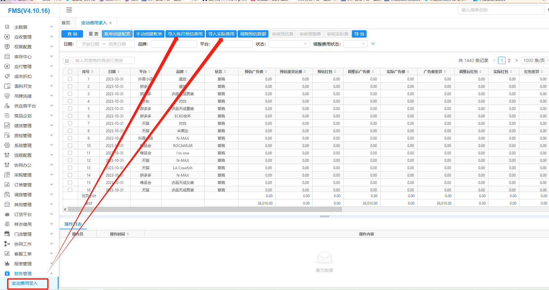 本功能主要用于搜集京东、天猫、唯品会、抖音小店、拼多多的广告费、以及拼多多的退货运费;由之前财务线下搜集调整为各品牌运营自己录入,财务审核。
