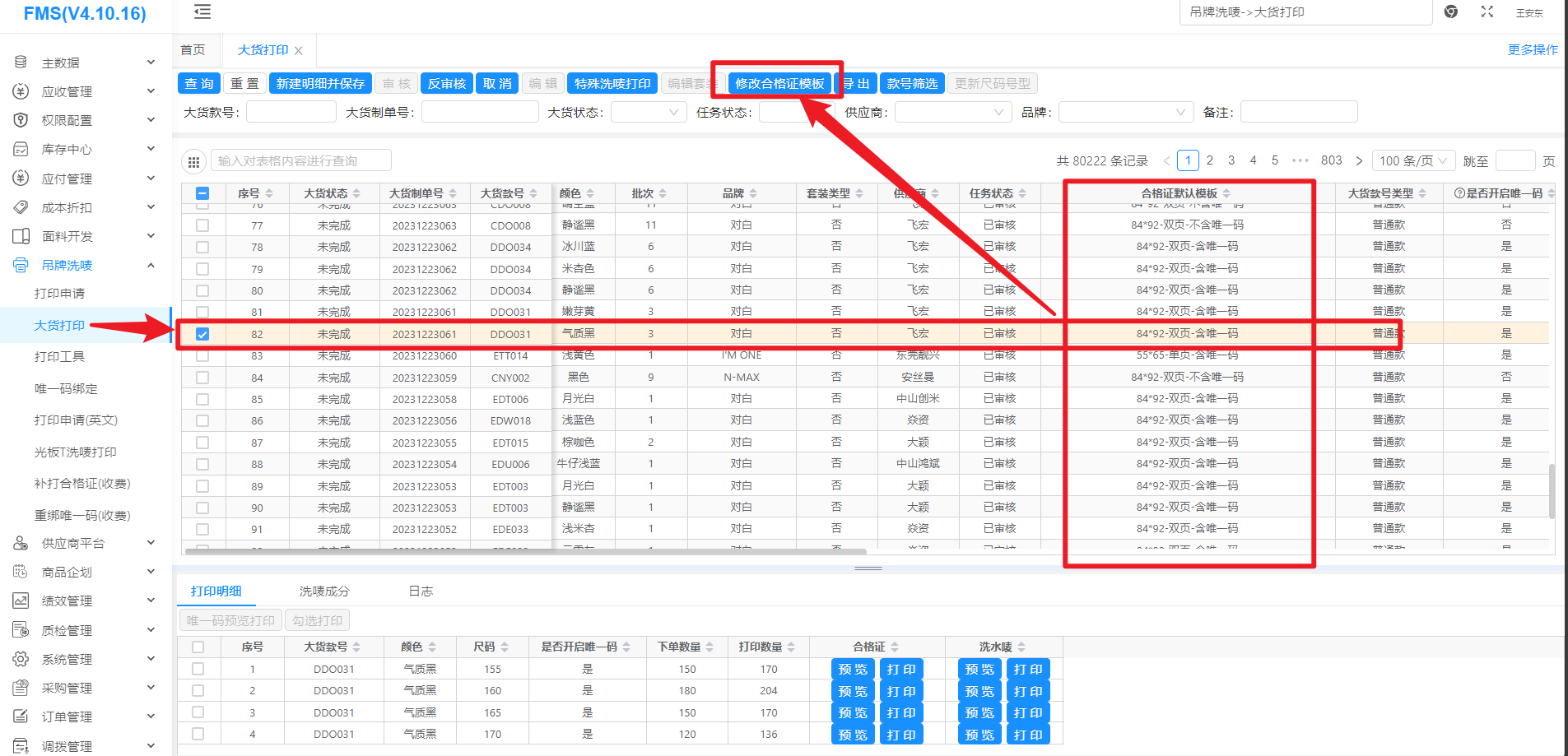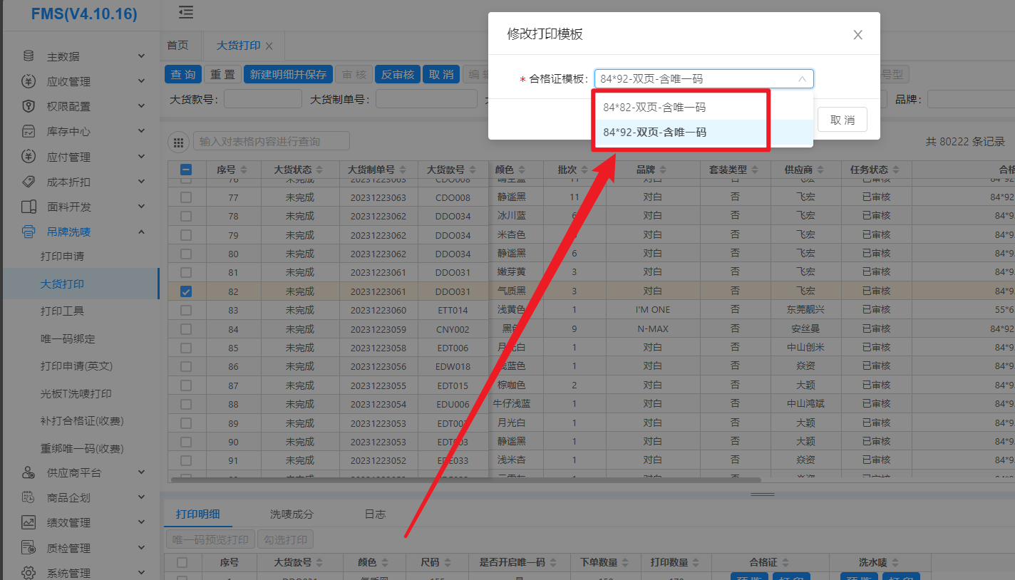 搜索要修改模板的款号,选中款号,点击修改合格证模板