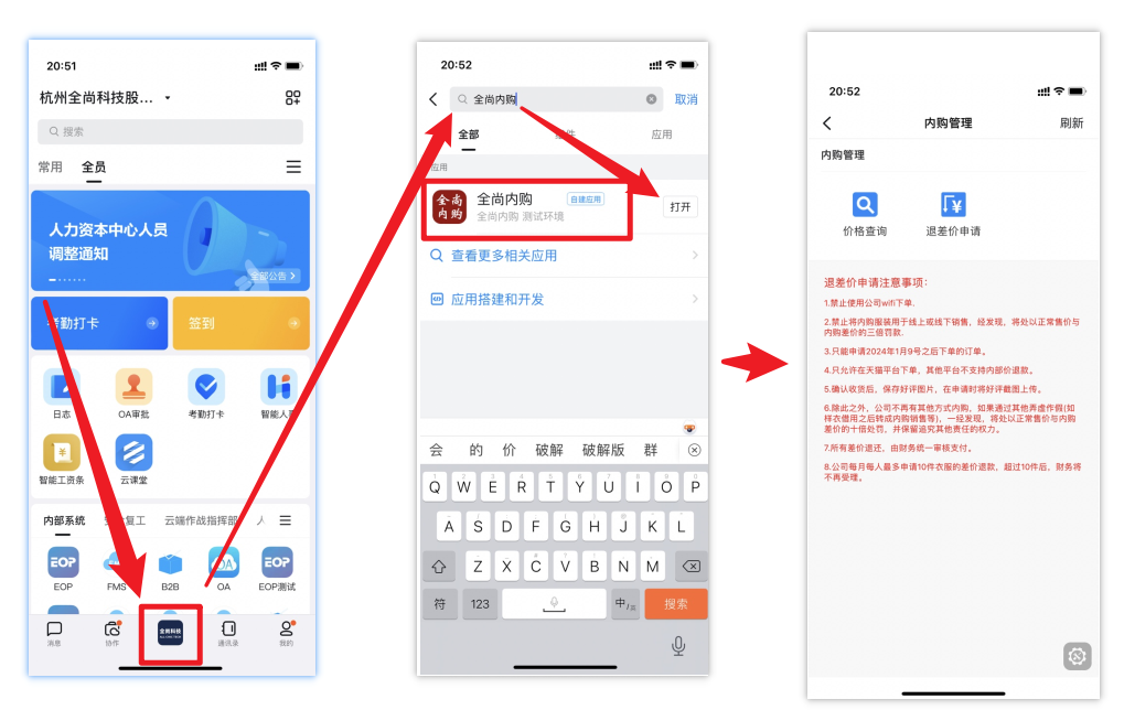 注:内部价格为全尚员工在天猫淘宝正常购买商品后,再申请退款后的最终价格。例如:一件衣服在淘宝售卖100元,内部价格60元,我们在淘宝正常购买消费100元,确认收货后,再进行好评评论,然后再来钉钉内申请差价退款40元,顺带上传好评截图,财务将通过淘宝后台进行退款,所以最终我们购买衣服的价格是60元。