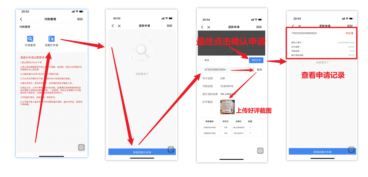 4. 退差价申请:将淘宝的原始订单号复制,在应用内选择“退差价申请”,点击下方按钮“新增退差价申请”,输入淘宝原始单号,点击查询,上传好评截图,最终点击确认申请;确认成功后可在本页面查看申请记录以及申请状态 。