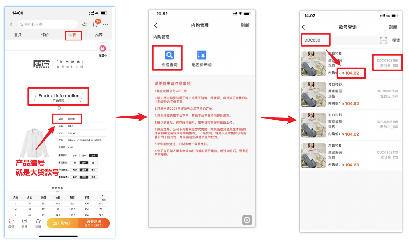 3.1 查询商品大货款号方法:每个淘宝商品都有详情页,找到详情页底部位置,查看产品信息–产品编号,产品编号就是大货款号,将大货款号在钉钉》价格查询中搜索,即可查看内部价