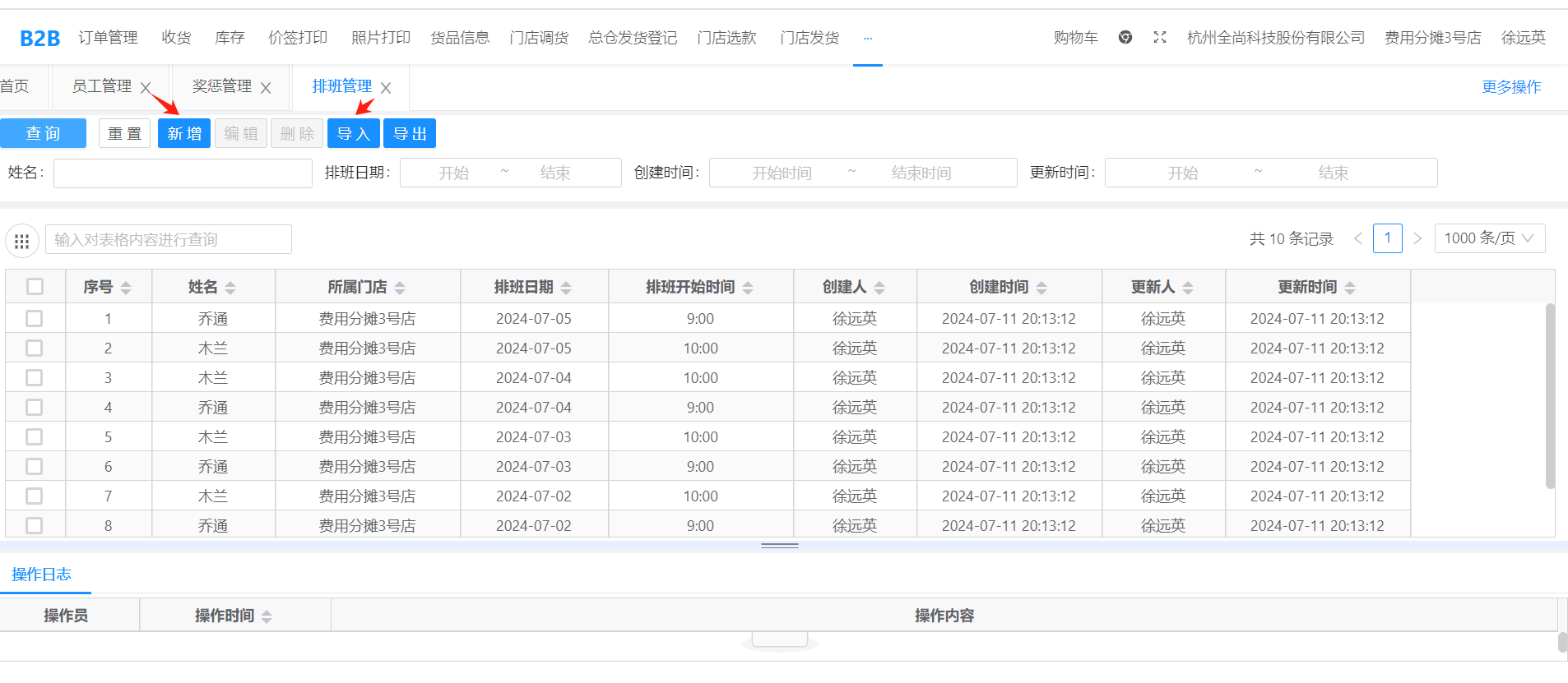 点击兼职员工管理->排班管理进入页面,进行员工排班管理,支持手动新增、编辑和excel导入,同一日期、同一人员只能有一个排班。