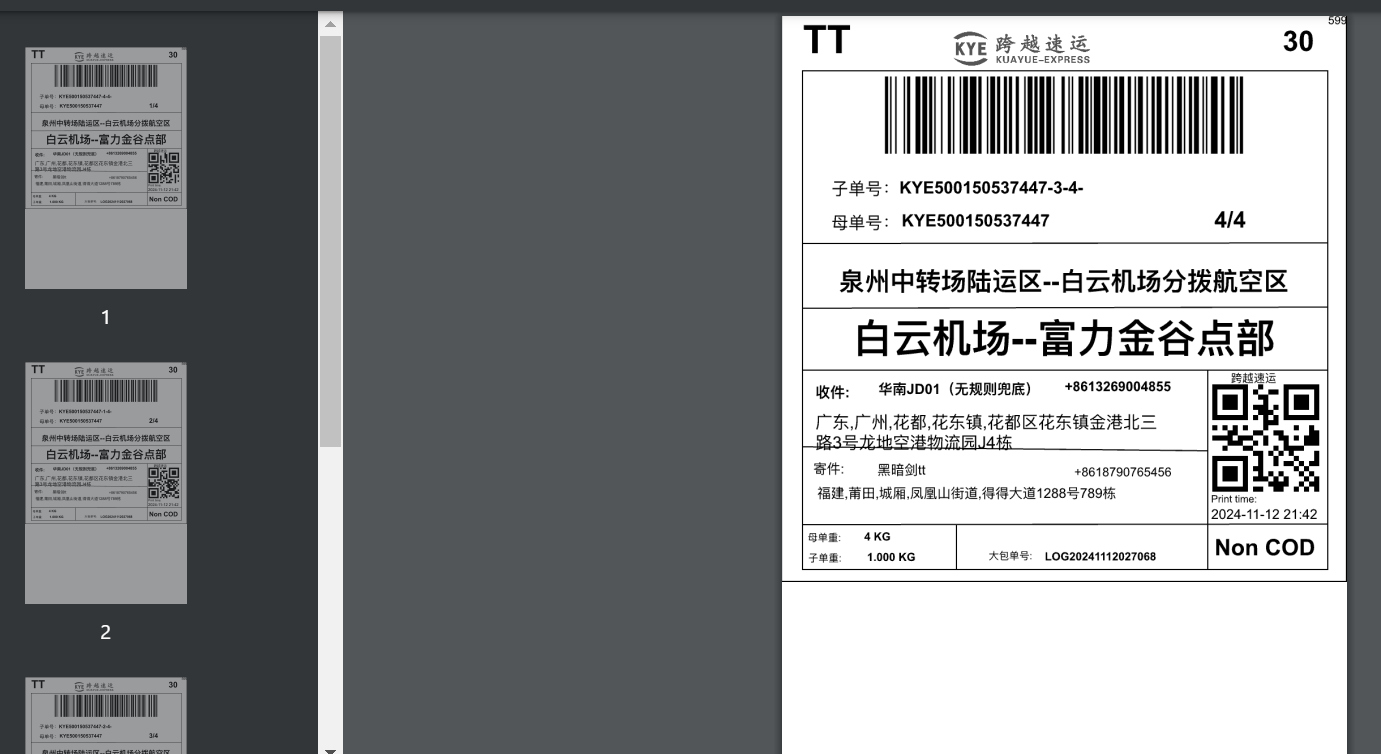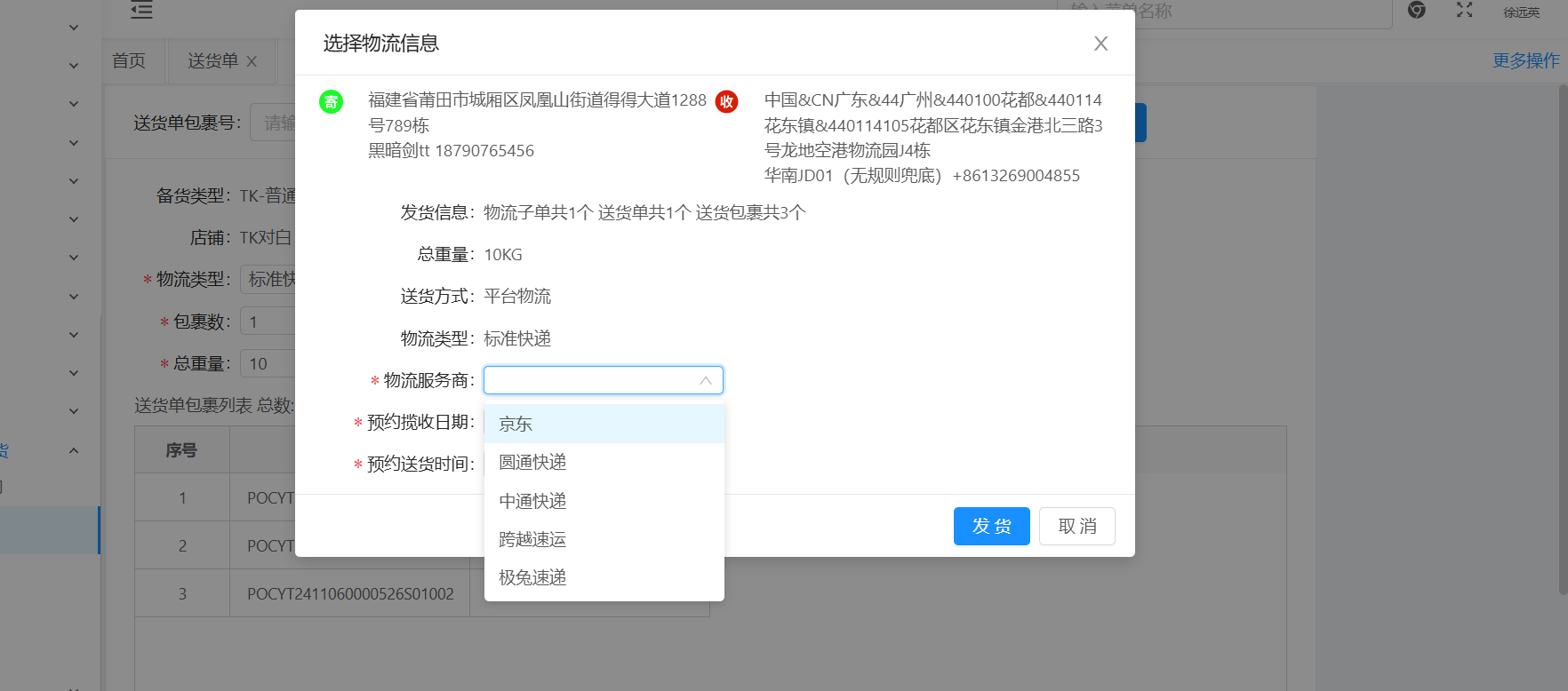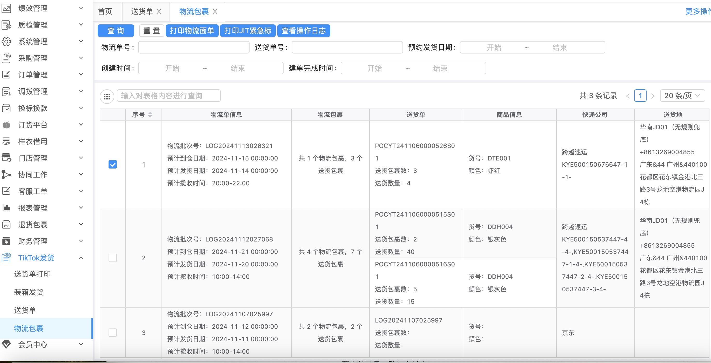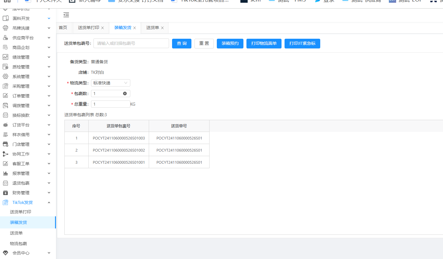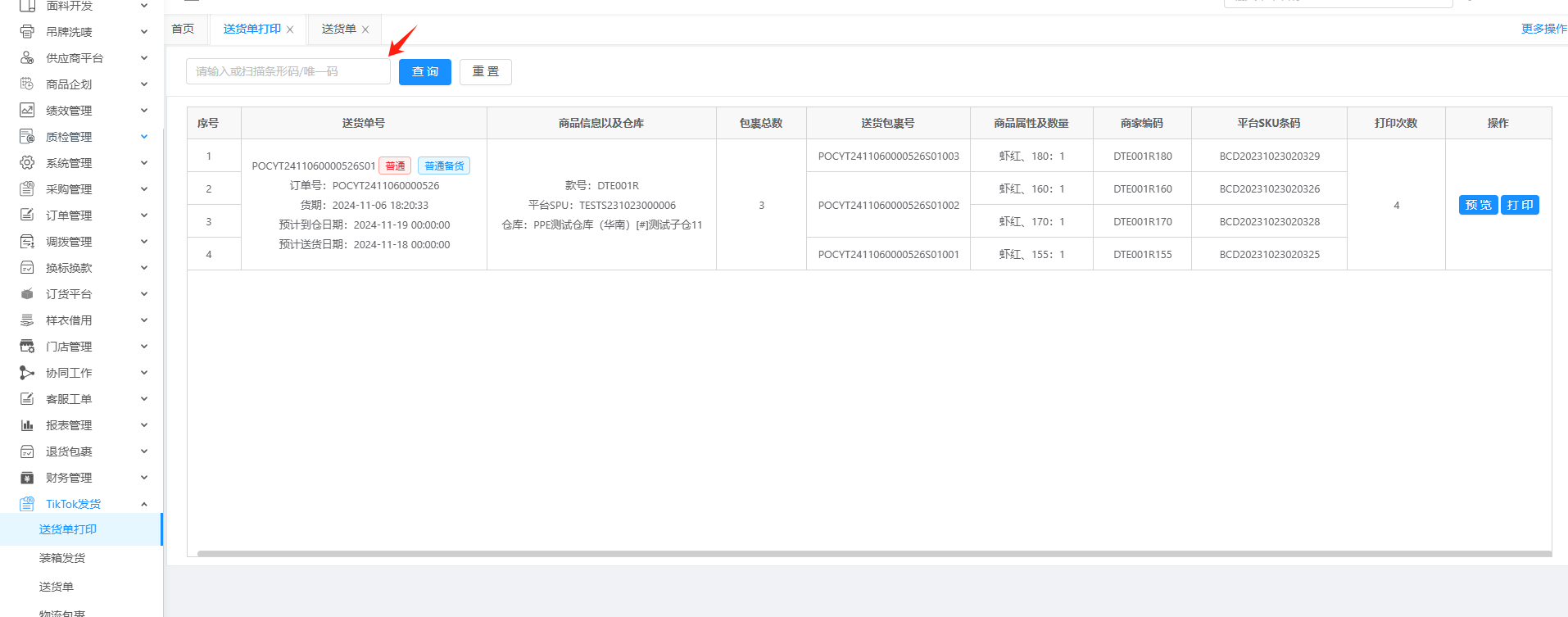 仓库扫描订单包裹中的任意一件大货商品条码/唯一码/大货五联单,自动匹配出待预约状态的发货单,并打印出TK平台要求粘贴的送货单包裹信息,粘贴在包裹上。如果出现多个送货单系统不会自动打印出送货单包裹信息,需要人工进行核对实物包裹和列表中的信息人工选择打印。