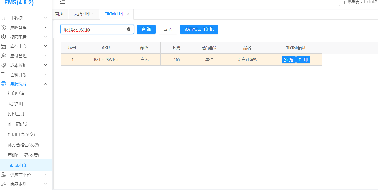 进入FMS->吊牌洗唛->TikTok打印功能页面,设置好默认打印机