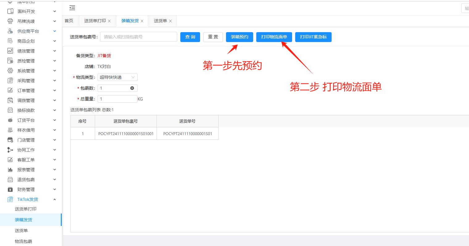 扫描送货单包裹号进行装箱预约,最长不超过2分钟,可再操作【打印物流面单】功能打出物流面单信息。